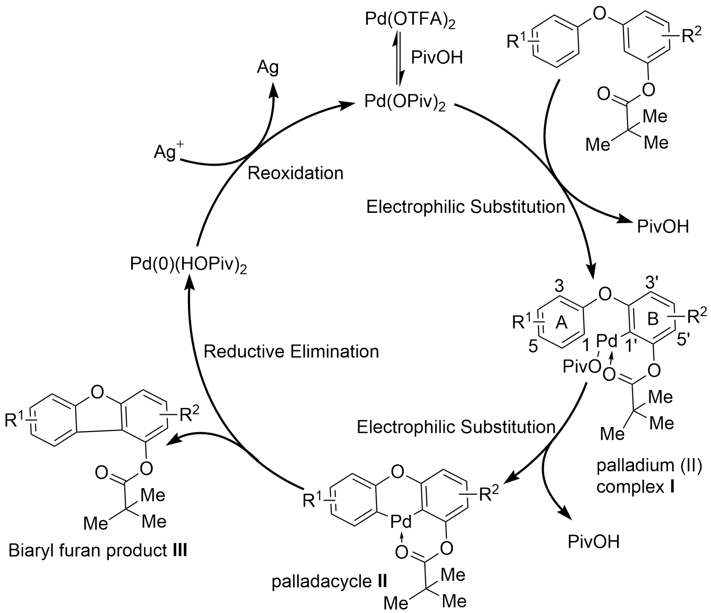Proposed mechanism for dibenzofuran scaffold formation catalyzed by Pd(TFA)2/AgOAc.