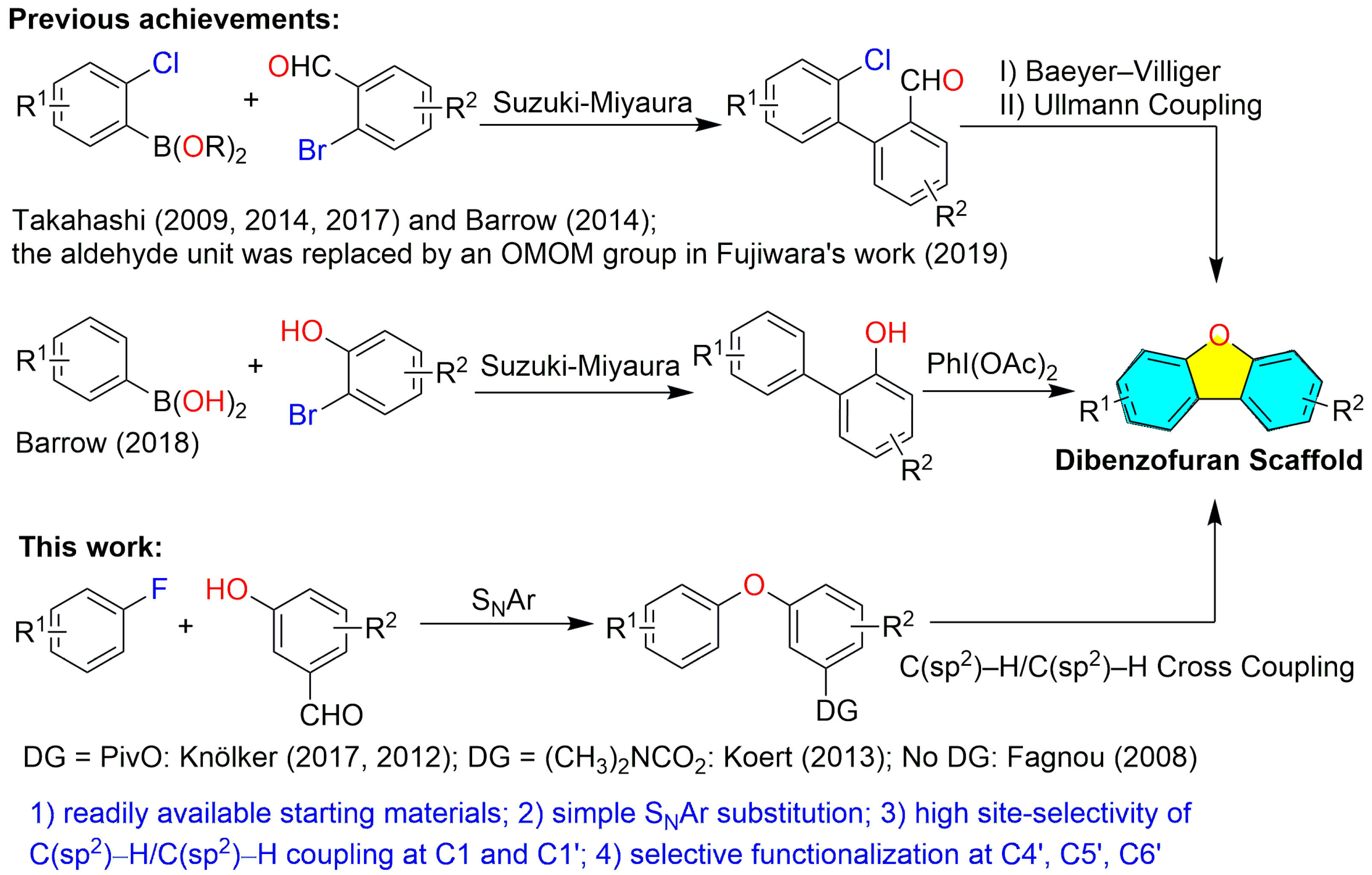 Notably, several previous studies have achieved the total syntheses of dibenzofuran-containing p-terphenyls (Figure 1), including vialinin B [5] and C [6], boletopsins 7, 11, and 12 [7], as well as kehokorins A–E [8,9]. A primary synthetic challenge in constructing these unique molecules lies in the assembly of their highly oxygenated dibenzofuran core (Scheme 1). To achieve site-selective furan ring formation, Takahashi [5,6,8], Barrow [7], and Fujiwara [9] developed strategies involving pre-functionalization of the four key positions with boronic acid, halogen (Cl, Br), and the aldehyde group or methoxymethoxy (OMOM) moiety. The dibenzofuran scaffold was then assembled through sequential Suzuki–Miyaura cross-couplings, Baeyer–Villiger oxidation, and intramolecular Ullmann coupling. Later, Barrow and co-workers [10] constructed the diphenyl fragment via Suzuki–Miyaura coupling and prepared the dibenzofuran core through an oxidative cyclization using PhI(OAc)2. In contrast, Knölker [11,12], Fagnou [13], and Koert [14] reported Pd-catalyzed-directed C(sp2)–H/C(sp2)–H oxidative coupling strategies for dibenzofuran synthesis, though some cases suffered from site-selectivity limitations [11,14,15]. Interestingly, despite its potential, this strategy has not yet been applied to the synthesis of p-terphenyl-type dibenzofurans, likely due to persistent challenges in regiocontrol.