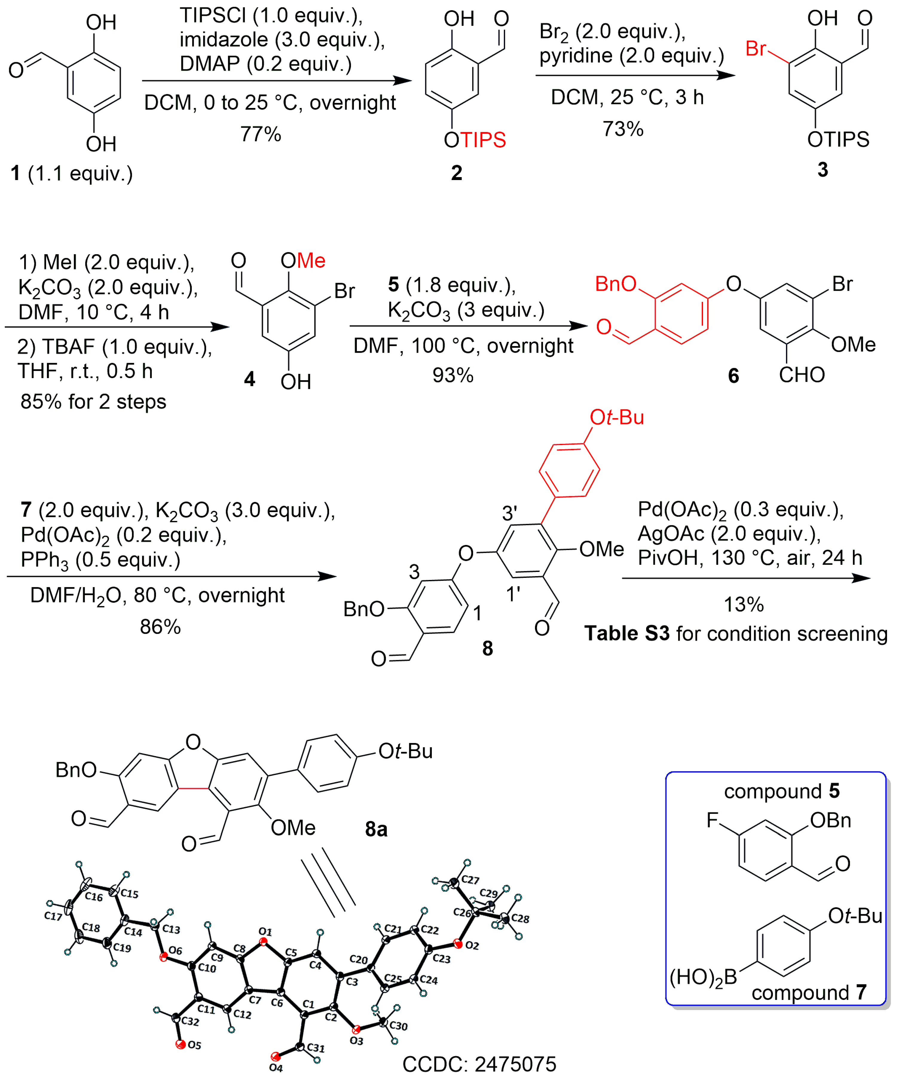 At this stage, attempts to cyclize compound 8 to form 8a (Scheme 3) under various conditions (Table S3, see Supporting Information) based on literature procedures [18] proved inefficient, affording a maximum yield of only 16% (entry 2, Table S3). Delightedly, X-ray crystallographic analysis confirmed that 8a was indeed the desired product (Scheme 3), cyclized at the correct positions (e.g., C–C bond formed between C1 and C1′, not between C1 and C3′, C1′ and C3, or C3 and C3′, Scheme 3), with almost no site-isomers detected. These results demonstrate successful site-selective furan formation. The observed regiocontrol is likely attributable to the substituent directing effect and the steric hindrance of the benzyloxy group on ring A, inducing oxidative coupling at the C1-position; the steric hindrance from ring C directs the second coupling site at the C1′-position.