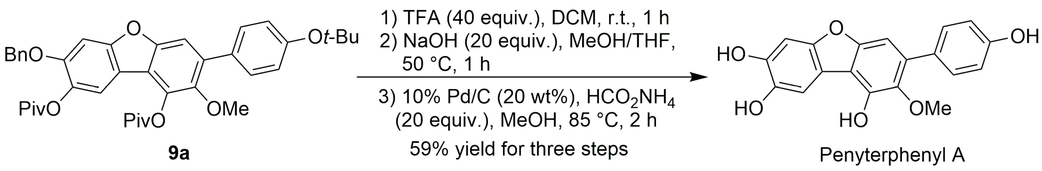 In a 10 mL vial, compound 9a (0.031 mmol, 20 mg, 1.0 equiv.) was dissolved in DCM (0.5 mL), and TFA (0.1 mL) was added dropwise, and the mixture was stirred at room temperature for 1 h. After the reaction was completed, DCM was removed under reduced pressure. Additional DCM (1.0 mL) was added, and the solvent was removed under reduced pressure; this procedure was repeated twice. The residue was dissolved in MeOH/THF mixture (1.0 mL, v/v = 1/1), followed by the addition of 2 M NaOH (0.62 mmol, 0.3 mL, 20 equiv.). The mixture was heated at 50 °C for 1 h. MeOH and THF were removed and the residue was dissolved in AcOEt (10 mL). The organic layer was washed with water (3 mL × 3) and removed. The residue was dissolved in MeOH (1.5 mL), and 10% Pd/C (4 mg, 20 wt%) and HCO2NH4 (0.62 mmol, 40 mg, 20 equiv.) were added, and the reaction mixture was heated at 85 °C for 2 h. MeOH was removed, and the residue was redissolved in AcOEt (10 mL). The organic layer was washed with water (3 mL × 3), dried over Na2SO4, and removed. The residue was dissolved in MeOH and purified by semi-preparative HPLC (RP-C18, MeOH/H2O = 60/40, flow rate = 3.0 mL/min, λ = 254 nm) to afford peniterphenyl A (tR = 16 min) as a colorless gel (6.0 mg, 59% yield over three steps from 9a). Its 1H/13C NMR signals were carefully assigned and listed in Table S1. The NMR data (Table S1, Figures S1 and S2) and the HRMS result (Figure S5) for synthesized peniterphenyl A were in excellent agreement with the natural one, indicating our successful synthesis of this natural product. TLC: Rf = 0.2 (PE/AcOEt = 1:1.5, UV254). 1H NMR (700 MHz, (CD3)2SO) δ 9.64 (s, 1H), 9.54 (s, 1H), 9.29 (s, 1H), 9.03 (s, 1H), 7.43 (d, J = 8.6 Hz, 2H), 7.39 (s, 1H), 6.96 (s, 1H), 6.89 (s, 1H), 6.84 (d, J = 8.6 Hz, 2H), 3.33 (s, 3H). 13C NMR (176 MHz, (CD3)2SO) δ 157.1, 153.1, 150.0, 145.9, 144.8, 142.5, 140.4, 132.4, 130.4, 129.3, 115.6, 114.7, 113.0, 107.6, 102.8, 98.7, 60.7. HRMS-ESI (m/z): calcd for C19H13O6 [M − H]– 337.0718, found 337.0726.