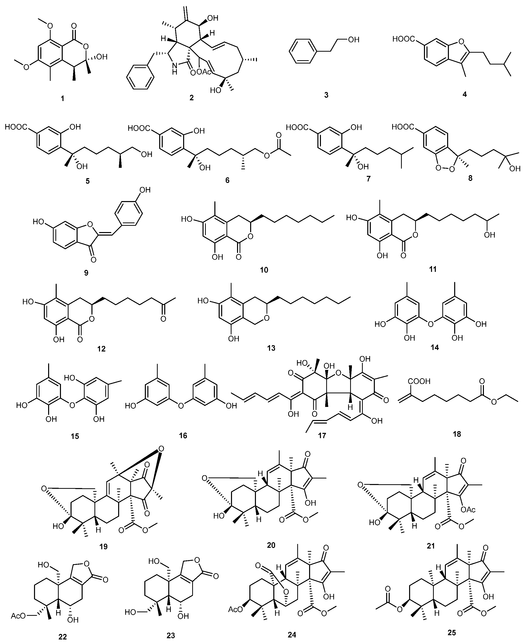 | 61 | alternanone C | Alternaria iridiaustralis | BSotrytis cinerea | [47] |