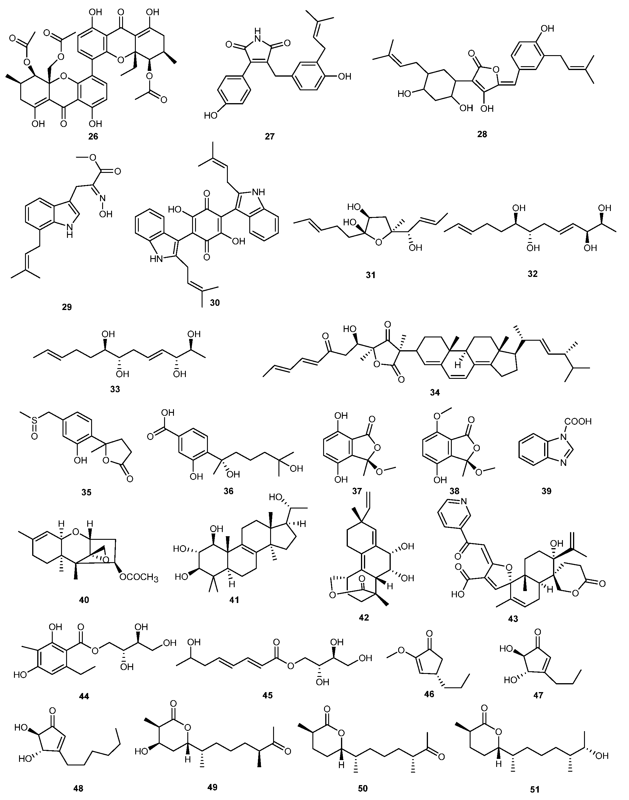 - Saad, M.M.G.; Abdelgaleil, S.A.M.; Shiono, Y. Antibacterial and Herbicidal Properties of Secondary Metabolites from Fungi. Nat. Prod. Res. 2021, 35, 5446–5451. [Google Scholar] [CrossRef]
