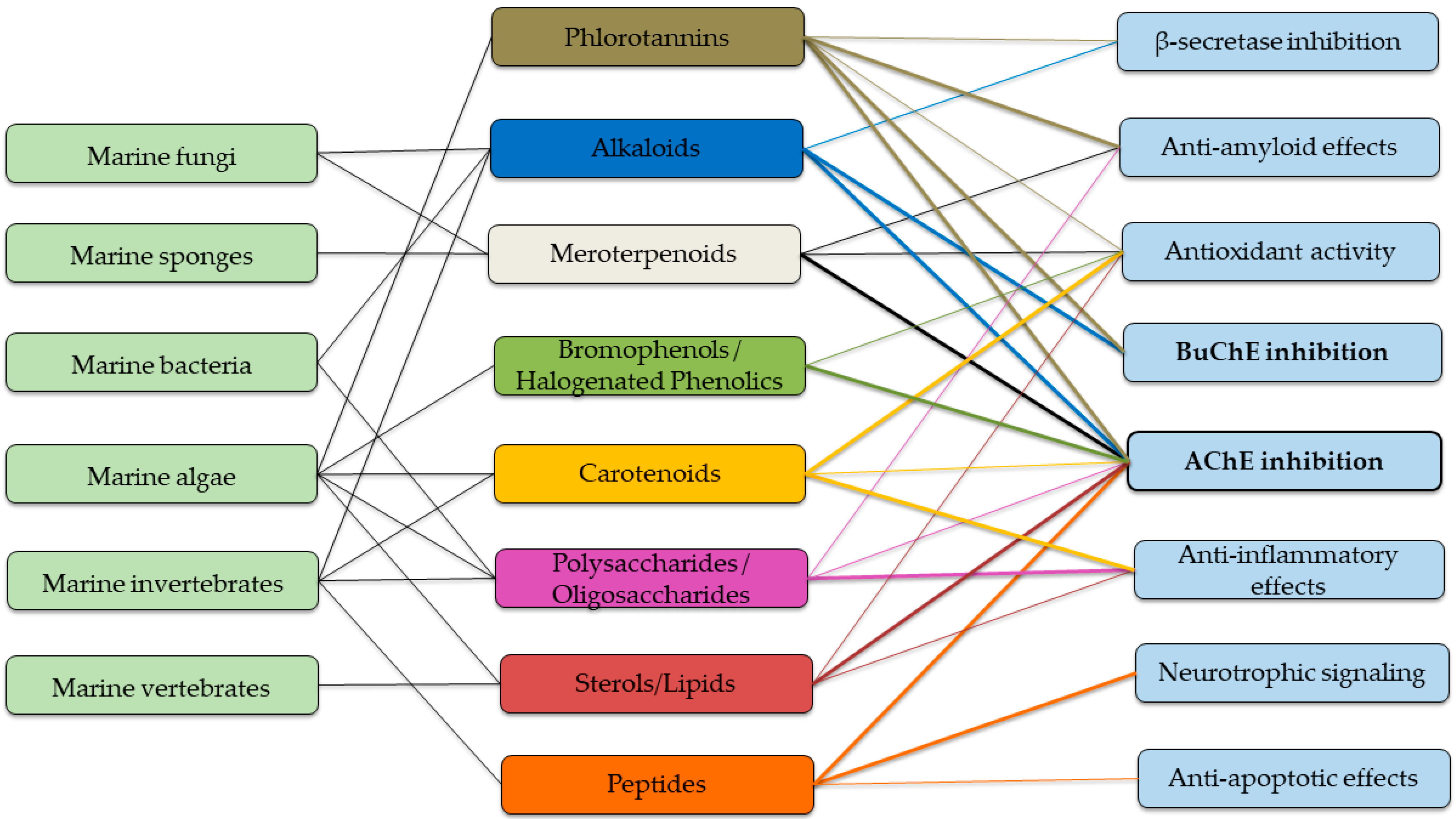 - Mechanistic studies that investigate various marine sources of substances with AChE-inhibitory activity—specifically their effects on the neurodegeneration process;