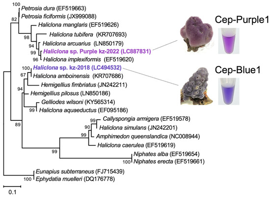 Phylogenetic tree based on cox1 gene sequences, including purple and blue Haliclona sp. The tree was constructed using the maximum likelihood method based on the cox1 gene sequences described in a previous study [13]. Numbers at the nodes indicate bootstrap values obtained using MEGA-X, and bootstrap proportions greater than 50% are shown next to the branches. The tree is rooted in the freshwater haplosclerids E. subterraneus and E. muelleri. GenBank accession numbers are indicated. Bar, 0.1 substitutions per nucleotide position.