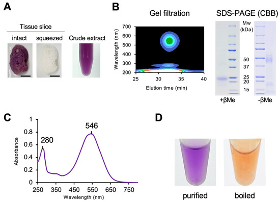 Purification of purple protein from a purple sponge, Haliclona sp.: (A) Change in body color before (left panel) and after (right panel) squeezing crude extracts from the sponge body. Scale bar, 1.0 cm. (B) Single elution peak detected with a photodiode array detector following gel filtration (left panel), and SDS-PAGE of the purified protein (right panel). (C) Absorption spectrum of the purified purple protein in Tris–HCl buffer (pH 7.5). (D) Color of the purified protein before (left panel) and after boiling (right panel).