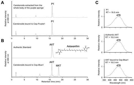 Carotenoid determination of the purified purple protein: (A) HPLC elution profiles of pigments extracted from the whole purple sponge body (upper panel) and those bound to purified Cep-Purple1 (lower panel). (B) HPLC elution profiles of authentic astaxanthin (upper panel) and pigments bound to Cep-Blue1 (lower panel). (C) Absorption spectra of peak P1 (upper panel), authentic astaxanthin (middle panel), and astaxanthin bound to purified Cep-Blue1 (lower panel). HPLC retention times (RTs) are indicated above the spectra, and the top wavelength of each peak is shown. The measured m/z values of AXT and P1 coincided, as described in the text. AXT, astaxanthin; MXT, mytiloxanthin.