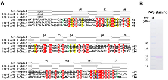 Bioinformatic analyses were performed as previously described [13]. Briefly, database searches for sequence homology were performed using the programs blastp (http://www.ncbi.nlm.nih.gov/BLAST/, accessed on 15 October 2025) and FASTA (http://www.genome.jp/tools/fasta/, accessed on 15 October 2025) with standard parameters. The N-terminal signal sequence was predicted using SignalP 6.0 (https://services.healthtech.dtu.dk/services/SignalP-6.0/, accessed on 15 October 2025). The N-linked glycosylation sites were predicted using the program NetNGlyc 1.0 (https://services.healthtech.dtu.dk/services/NetNGlyc-1.0/, accessed on 15 October 2025). Protein sequences were aligned using ClustalW 2.0 [35]. Secondary structure predictions of Cep-Purple1 were performed using Phyre2.2 (https://www.sbg.bio.ic.ac.uk/~phyre2/html/page.cgi?id=index, accessed on 15 October 2025) [39]. The molecular mass was calculated by GENETYX-MAC software version 5.1 (Genetyx Corporation, Tokyo, Japan).