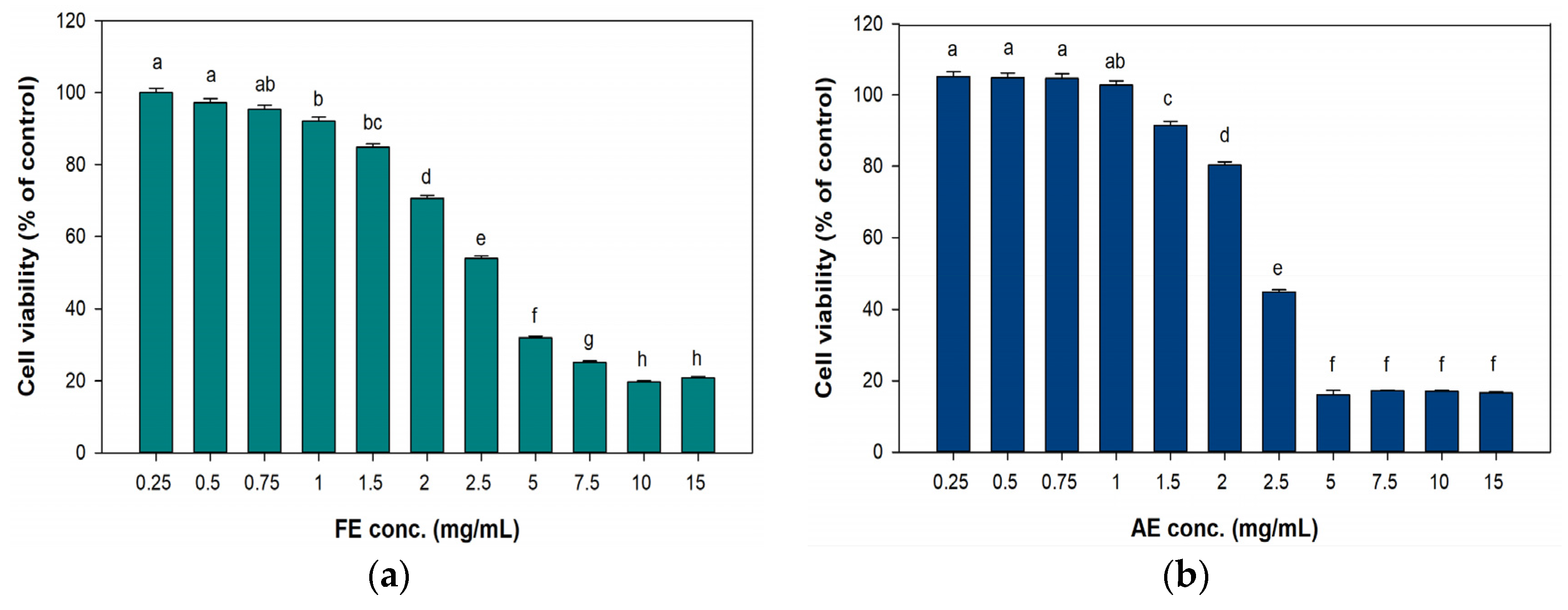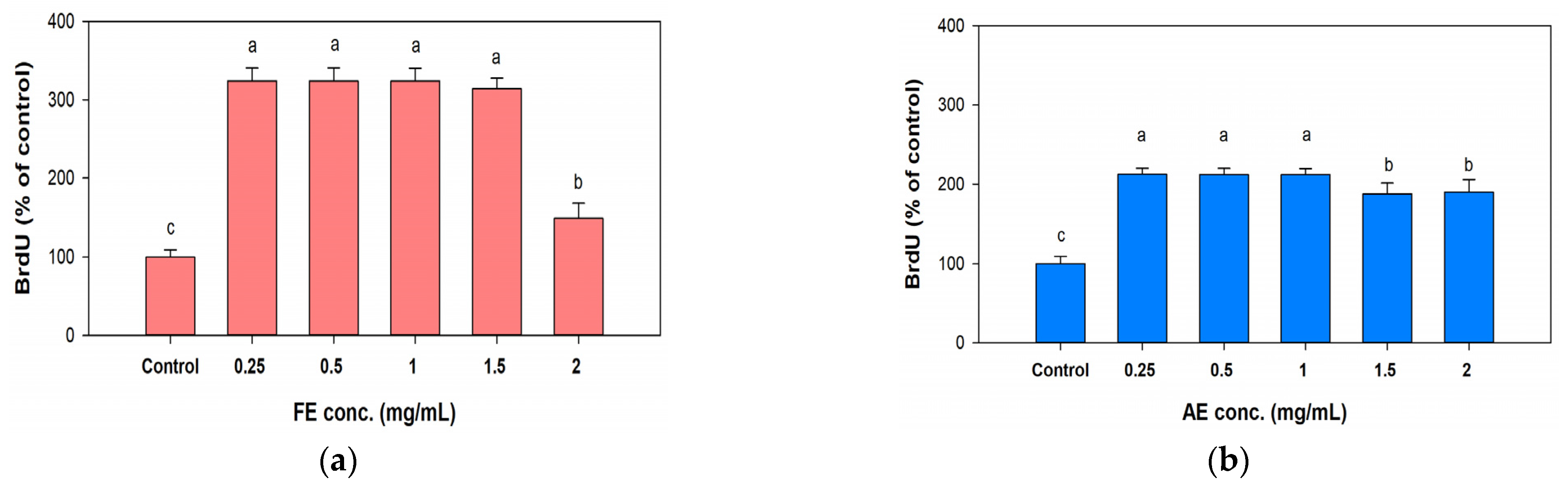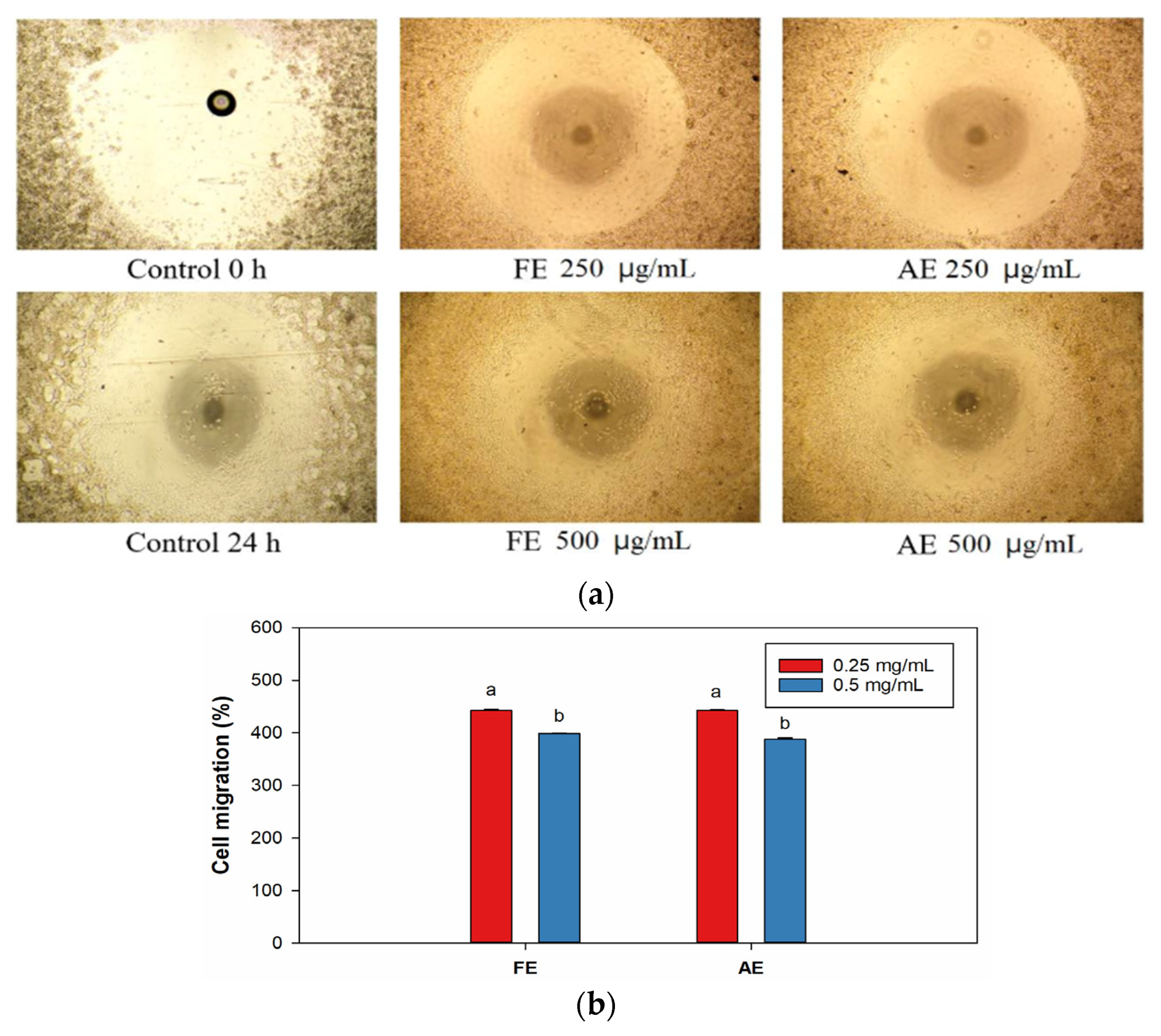2.3. Cell Cytotoxicity, Proliferation, and Migration of Fibroblast Cells