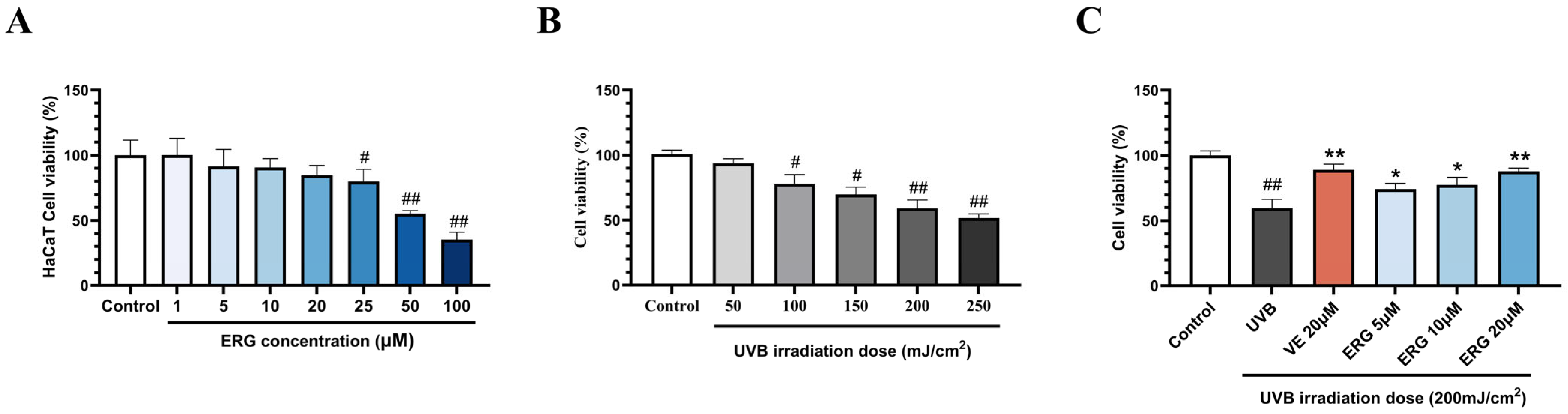 2.1. ERG Alleviates UVB-Induced Photodamage in HaCaT Cells