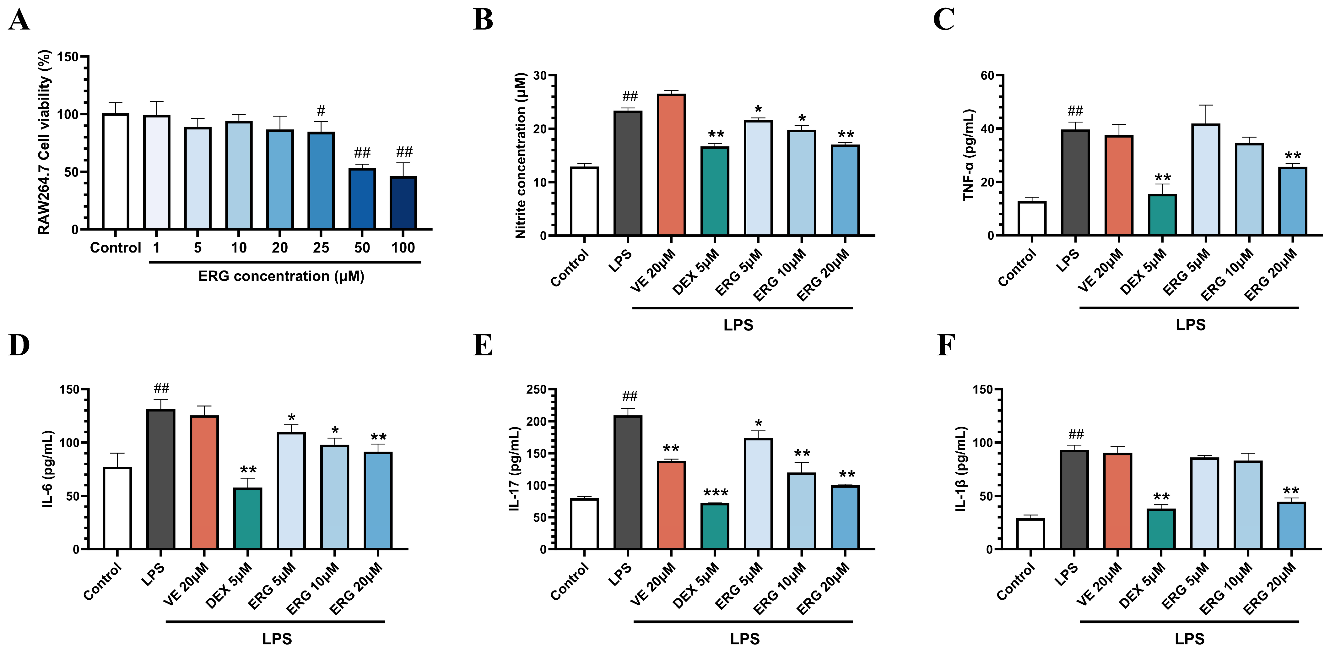 2.3. ERG Alleviates Inflammation in LPS-Induced RAW264.7 Cells