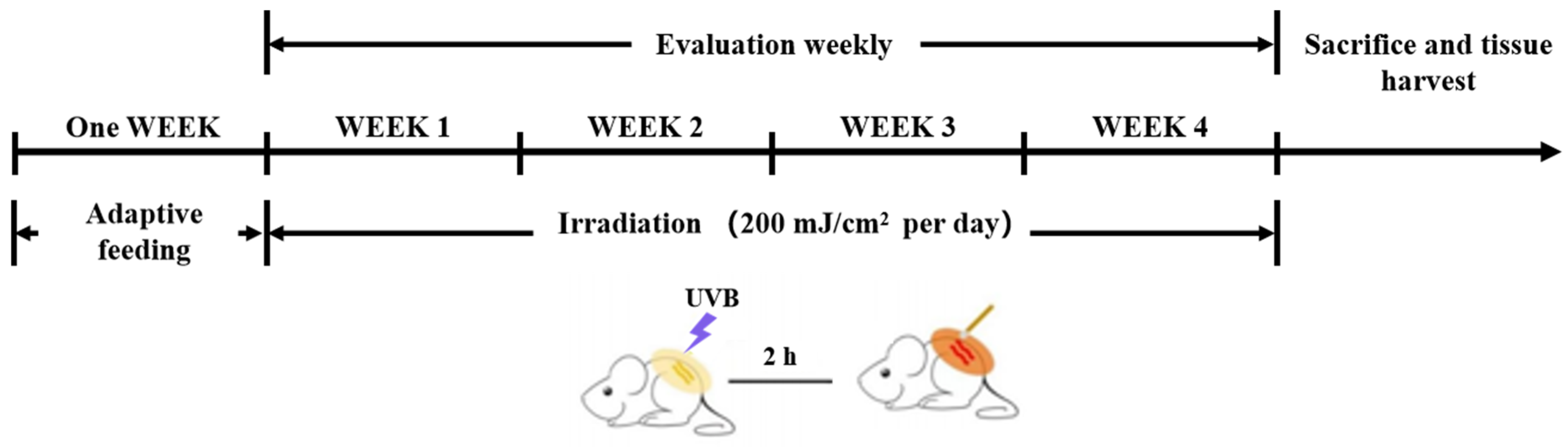- Wei, M.; Li, M.; Li, Y.; Wang, B.; Yan, Y.; Li, L. Upregulation of Receptor Interacting Protein 1 Induced by UVB Contributes to Photodamage of the Skin Through NF-kappaB Pathway In Vivo and In Vitro. J. Cosmet. Dermatol. 2025, 24, e70082. [Google Scholar] [CrossRef]