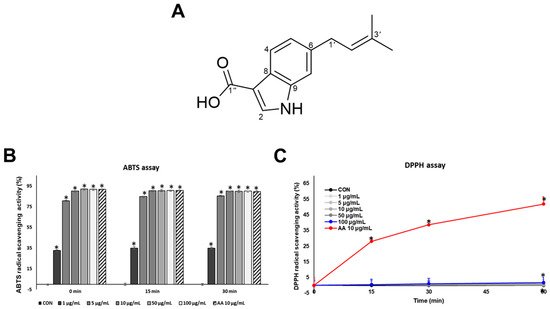 Chemical structure of SJ196 and its antioxidant activity evaluated by ABTS and DPPH assays: (A) Chemical structure of SJ196. Antioxidant activity was determined using (B) the ABTS assay and (C) the DPPH assay. Radical scavenging activity was measured spectrophotometrically at 517 nm. Ascorbic acid (AA, 10 μg/mL) was used as a positive control. Data are presented as mean ± SD (n = 4; * for p < 0.05 vs. control).
