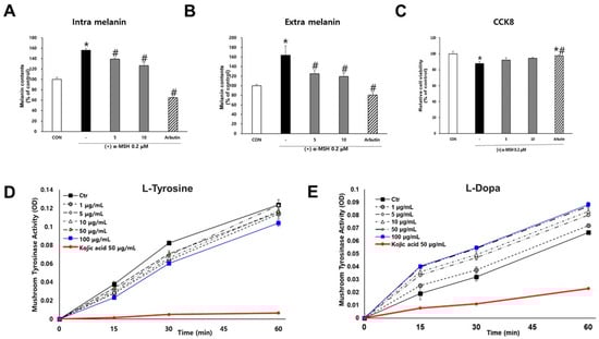 Cell viability was determined using the Cell Counting Kit-8 (CCK-8; Dojindo Laboratories, Kumamoto, Japan) according to the manufacturer’s instructions. Cells were seeded in 48-well plates and treated with SJ196 at concentrations of 5 and 10 μg/mL. Cells treated with 0.2 μM α-melanocyte-stimulating hormone (α-MSH) served as the negative control, while those treated with 50 μg/mL arbutin served as the positive control. After 48 h of incubation, the culture medium was removed, and 130 μL of diluted CCK-8 solution was added to each well. The plates were protected from light and incubated for 3 h at 37 °C. Following incubation, 100 μL of each reaction mixture was transferred to a 96-well plate, and absorbance was measured at 450 nm using a BioTek Epoch microplate reader (Epoch, Biotech Instruments, Agilent, Chicago, IL, USA).