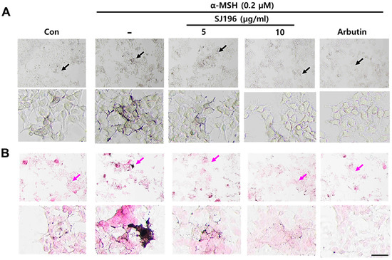 B16F10 cells were seeded in 48-well plates at a density of 2.0 × 104 cells per well and allowed to adhere for 24 h. Test compounds were diluted in phenol red-free medium and applied for 48 h. Cells treated only with 0.2 μM α-MSH served as the negative control, whereas those treated with 50 μg/mL arbutin served as the positive control. SJ196 was administered at final concentrations of 5 and 10 μg/mL in medium containing 0.2 μM α-MSH. To determine extracellular melanin content, 150 μL of the culture supernatant was transferred to a 96-well plate, and absorbance was measured at 405 nm using a microplate reader. For intracellular melanin quantification, the remaining medium was removed, and 200 μL of 1 M NaOH solution was added to each well to lyse the cells. The plates were then covered to protect from light and incubated in a dry oven at 60 °C for 1 h. Subsequently, 100 μL of each lysate was transferred to a 96-well plate, and absorbance was measured at 405 nm using a microplate spectrophotometer, Infinite M200 Pro microplate reader (NFEC-2021-08-272460), Tecan Group Ltd., Mannedorf, Switzerland, equipped at Ewha Drug Development Research Core Center. A 40 mg/mL NaOH solution (100 μL) was used as a blank control, and the melanin content was expressed as a percentage relative to the untreated control group.