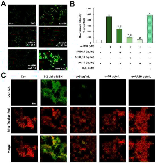 Effect of SJ196 on α-MSH-induced ROS production in B16F10 cells. Cells treated with α-MSH alone served as a negative control, and cells treated with AA (10 μg/mL) served as a positive control. B16F10 cells were treated with 0.2 μM α-MSH and SJ196 for 48 h: (A) ROS levels were visualized using DCF-DA fluorescence staining (100×). Bar = 100 μm. (B) Fluorescence intensity was quantified using ImageJ software (https://imagej.net/ij/, accessed on 1 August 2025). (C) Double staining with DCF-DA (green) and MitoTracker (red) was performed, and representative images were obtained by confocal microscopy (400×). Bar = 20 μm. Data are presented as mean ± SE (n = 3; * for p < 0.05 vs. control; # for p < 0.05 vs. α-MSH group).