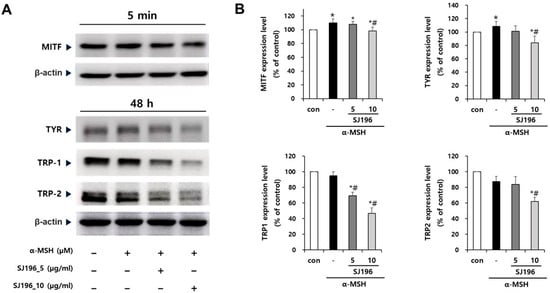 Effect of SJ196 on protein expression of melanogenesis-related targets in B16F10 cells. B16F10 cells stimulated with 0.2 μM α-MSH were treated with SJ196 (5 and 10 μg/mL) for 48 h (TYR, TRP-1, TRP-2) or 5 min (MITF). Cells treated with α-MSH alone served as a negative control: (A) Protein levels of TYR, TRP-1, TRP-2, and MITF were assessed by Western blotting. (B) Quantification of band intensities was performed using ImageJ software. β-actin was used as a loading control. Data were normalized to β-actin expression and are presented as mean ± SE (n = 3; * for p < 0.05 vs. control; # for p < 0.05 vs. α-MSH group).
