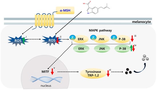 During the process of melanogenesis, tyrosinase-mediated oxidation reactions generate ROS as by-products, thereby exposing melanocytes to a significant level of oxidative stress [13]. Under physiological conditions, endogenous antioxidant systems, including glutathione, thioredoxin, and catalase, mitigate ROS accumulation to prevent aberrant signaling [14]. However, when oxidative stress overwhelms cellular defense mechanisms, ROS activate mitogen-activated protein kinase (MAPK) pathways—such as ERK, JNK, and p38—as well as other kinases, which enhance MITF transcription, stability, and activity. Consequently, the expression of TYR, TRP-1, and TRP-2 is amplified [15,16]. This feedforward interaction suggests that inhibiting tyrosinase alone, without alleviating oxidative stress, may be insufficient to effectively suppress hyperpigmentation.