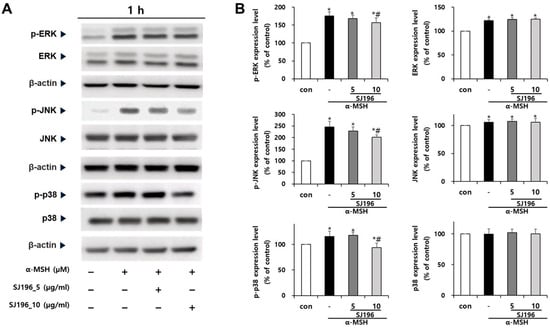 Effect of SJ196 on MAPK (ERK, JNK, and p38) phosphorylation in α-MSH-stimulated B16F10 cells. Cells stimulated with 0.2 μM α-MSH were treated with SJ196 (5 and 10 μg/mL) for 1 h. α-MSH alone served as a negative control: (A) Protein expression levels of total and phosphorylated ERK, JNK, and p38 were analyzed by Western blotting. (B) Quantitative analysis was performed using ImageJ software. β-actin was used as a loading control. Data are normalized to β-actin expression and are presented as mean ± SE (n = 3; * for p < 0.05 vs. control; # for p < 0.05 vs. α-MSH group).