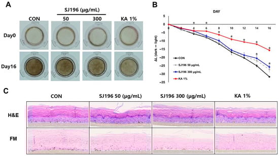 Effect of SJ196 on Melanoderm™, a 3D human pigmented epidermal model. Melanoderm™ tissues were treated with SJ196 (50 and 300 μg/mL) or KA (1%) every two days for 16 days. KA (1%) served as a positive control: (A) Macroscopic tissue color was evaluated on days 0 and 16. (B) Brightness (ΔL values) was measured every two days from day 0 to day 16. (C) On day 16, tissues were subjected to H&E and Fontana–Masson staining. Data are presented as mean ± SE (n = 3; * for p < 0.05 vs. control).