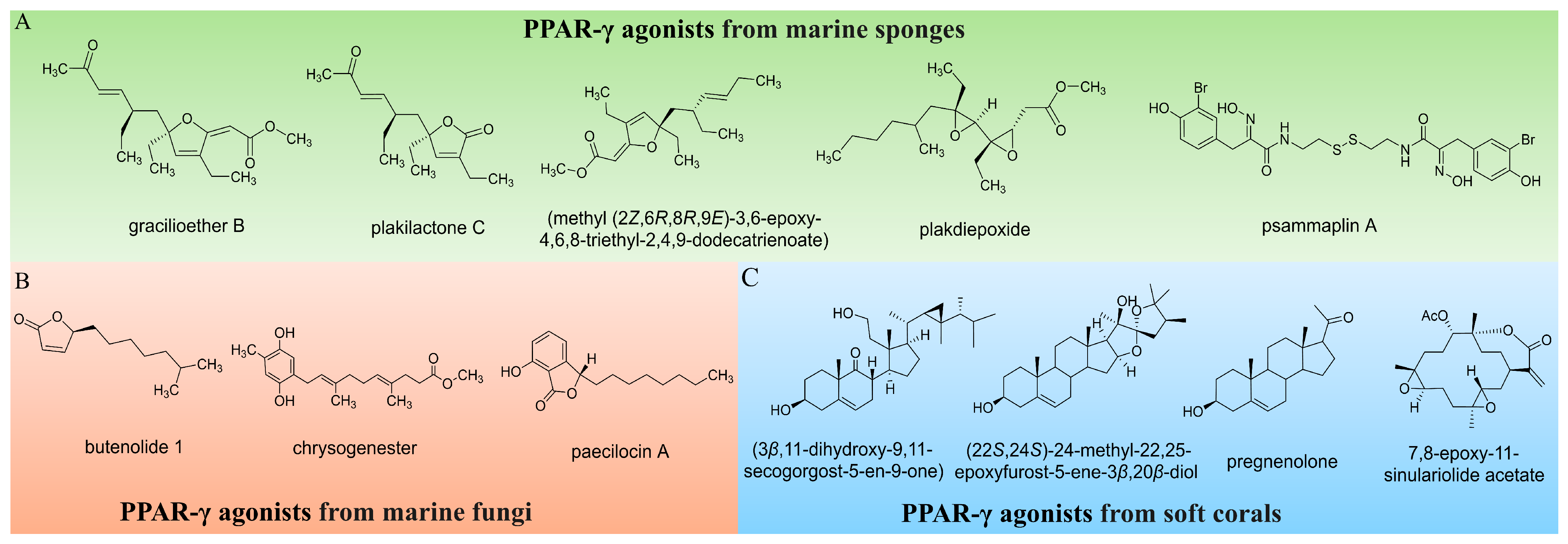 Figure 1. Representative marine-derived compounds with PPAR-γ agonistic activity. (A) PPAR-γ agonists from marine sponges. (B) PPAR-γ agonists from marine fungi. (C) PPAR-γ agonists from soft corals.