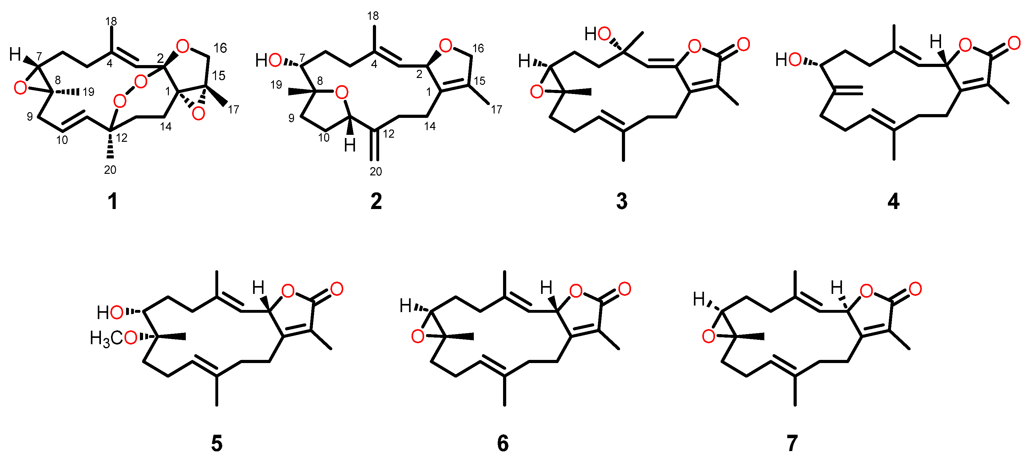 Freshly samples of S. crassocaule were frozen immediately at −20 °C after collection and stored at that temperature before they were exhaustively extracted by acetone. The Et2O-soluble portion of the acetone extract of the title animal was subjected to repeated chromatography, including with silica gel, Sephadex LH-20, and RP-HPLC, to yield seven compounds (17) (Figure 2). The known compounds 37 were readily identified as metabolite 8 (assigned herein as 3) in the reference paper [18], 7α-hydroxy-Δ8(19)-deepoxysarcophine (4) [18], 7α-hydroxyl-8α-methoxydeepoxysarcophine (5) [19], sarcophine (6) [20], and 2-epi-sarcophine (7) [20], respectively, by direct comparison of their NMR spectroscopic data with those reported in the literature.