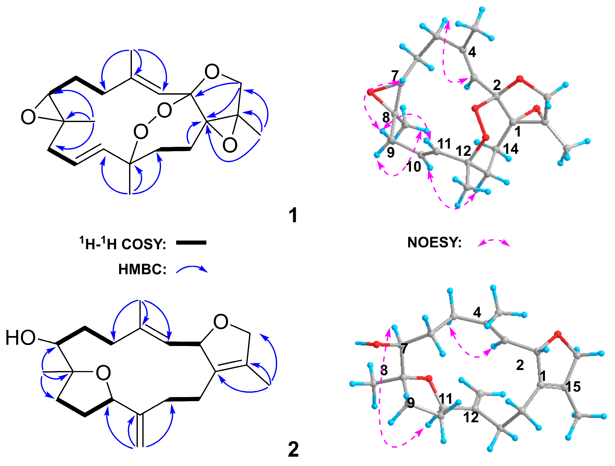 Compound 1 was isolated as a colorless crystal. The HR-ESIMS spectrum exhibited a peak at m/z 349.2004 ([M + H]+, calcd for 349.2009) establishing its molecular formula as C20H28O5, implying seven degrees of unsaturation. Detailed analysis of the 1D and 2D NMR spectra revealed the presence of one trisubstituted double bond [δH 5.37 (1H, s), δC 117.80 (CH, C-3) and δC 143.57 (qC, C-4)], one disubstituted double bond [δH 5.50 (1H, m), δH 5.64 (1H, d, J = 16.80 Hz), δC 123.43 (CH, C-10) and δC 135.97 (CH, C-11)], two epoxy moieties [δH 2.64 (1H, m), δC 61.58 (qC, C-7), δC 61.83 (CH, C-8); δC 65.72 (qC, C-1), δC 68.75 (qC, C-15)], and one oxymethylene group [δC 71.05 (CH2, C-17), δH 3.97 (1H, d, J = 9.81 Hz) and δH 4.07 (1H, d, J = 9.81 Hz)]. 1H–1H COSY correlations established the connectivity of H-5 (δH 2.34)/Ha-6 (δH 2.05), Hb-6 (δH 1.73)/H-7 (δH 2.64), H-9 (δH 1.76)/H-10 (δH 5.50)/H-11 (δH 5.64), and H-13 (δH 2.16)/H-14 (δH 1.74), while key HMBC correlations from CH3-18 to C-3/C-4/C-5, from CH3-19 to C-7/C-8/C-9, and from CH3-20 to C-11/C-12/C-13 enabled the construction of the 14-membered ring skeleton. Furthermore, HMBC correlations from CH3-17 to C-15, C-1, and C-16, and from H-16 to C-2, C-15, and C-1 indicated the formation of an oxygen-containing bridge between C-2 and C-16. These structural elements account for six degrees of unsaturation. The observed downfield chemical shifts in C-2 (δC 112.39) and C-12 (δC 86.53), along with the remaining degree of unsaturation, led us to postulate the presence of a peroxide bridge linking these two carbon atoms, as illustrated in Figure 3.