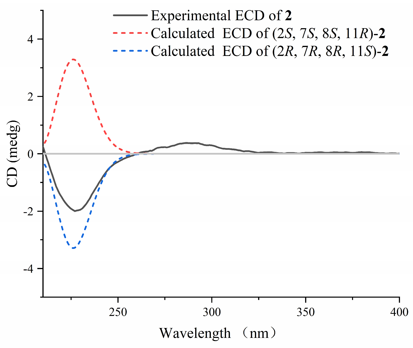 Figure 5. Experimental spectrum of 2 (black solid line), calculated ECD spectra of (2S, 7S, 8S, 11R)-2 (red dashed line), and (2R, 7R, 8R, 11S)-2 (blue dashed line).