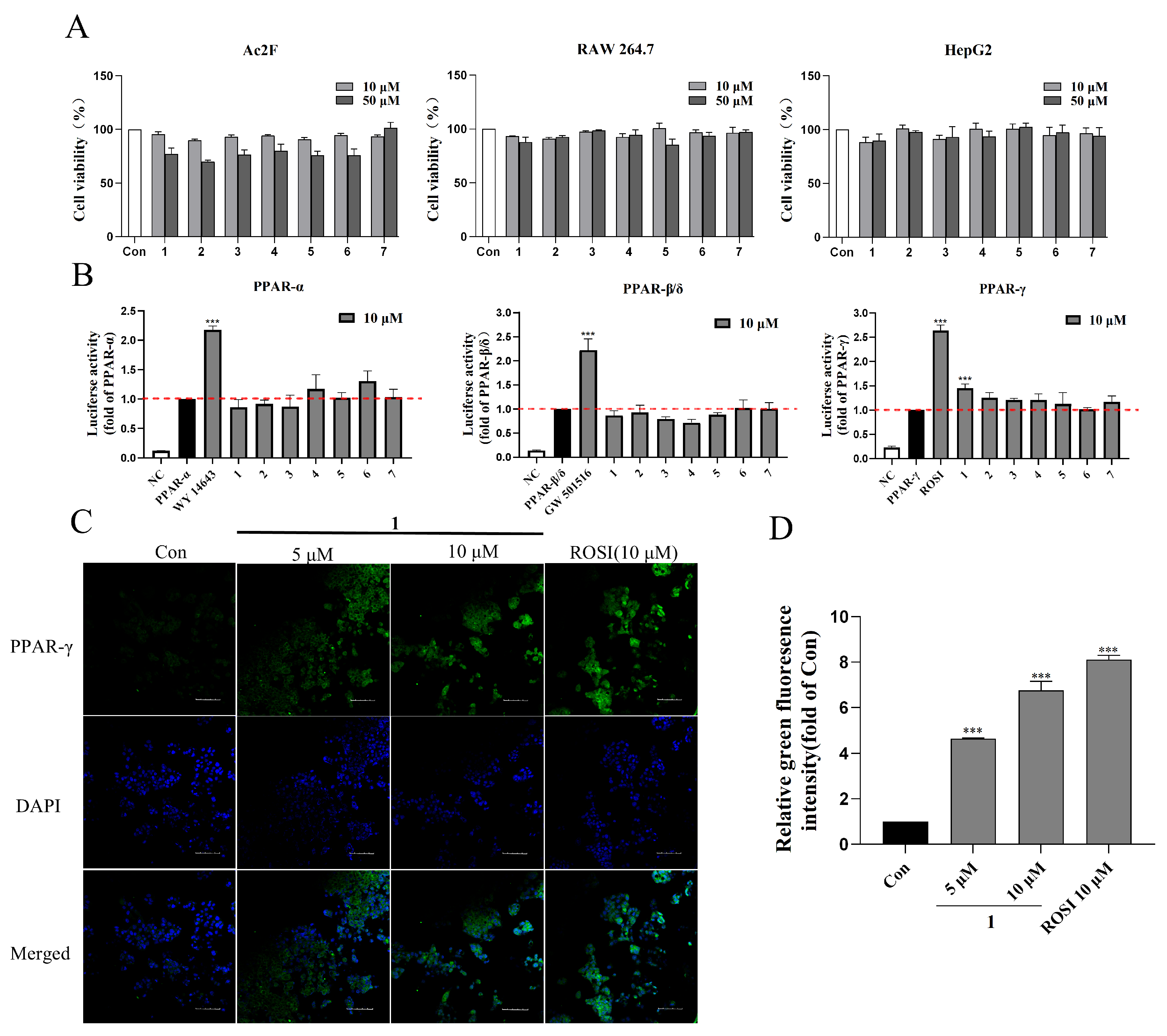 Figure 6. The effects of compounds 17 on the cell viability and transcriptional activation of PPARs. (A) Effects of compounds on Ac2F, RAW 264.7, and HepG2 cell viability; (B) The PPAR-α/β/γ transcriptional activity of the compounds were evaluated by luciferase assay. WY14643, GW501516, and rosiglitazone (ROSI) were used as positive control for PPAR-α, PPAR-β/δ, and PPAR-γ activation, respectively. (C) PPAR-γ was visualized using confocal microscopy as green fluorescence and the cell nucleus was viewed as cyan fluorescence by DAPI staining. (D) Quantification of PPAR-γ expression. *** p < 0.001 vs. PPAR-α, -β/δ or -γ group. The scale bar represents 100 μm.