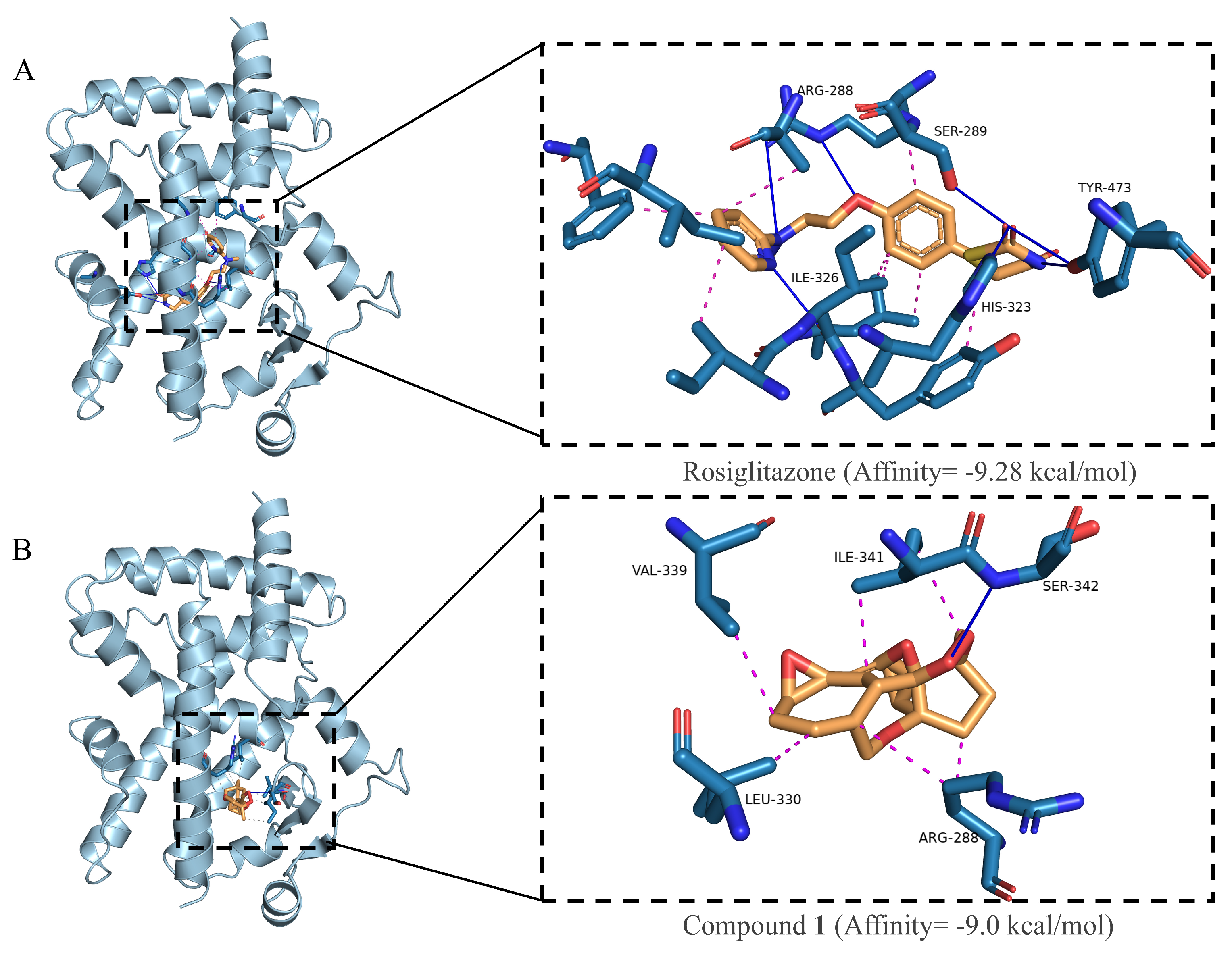 Figure 7. Docking simulation of ligand and PPAR-γ (PDB ID:4EMA) interaction. (A) Docking pose and binding interactions of rosiglitazone with PPAR-γ. (B) Docking pose and binding interactions of compound 1 with PPAR-γ. H-bonds were shown in blue line, hydrophobic interactions were shown in pink dotted line.