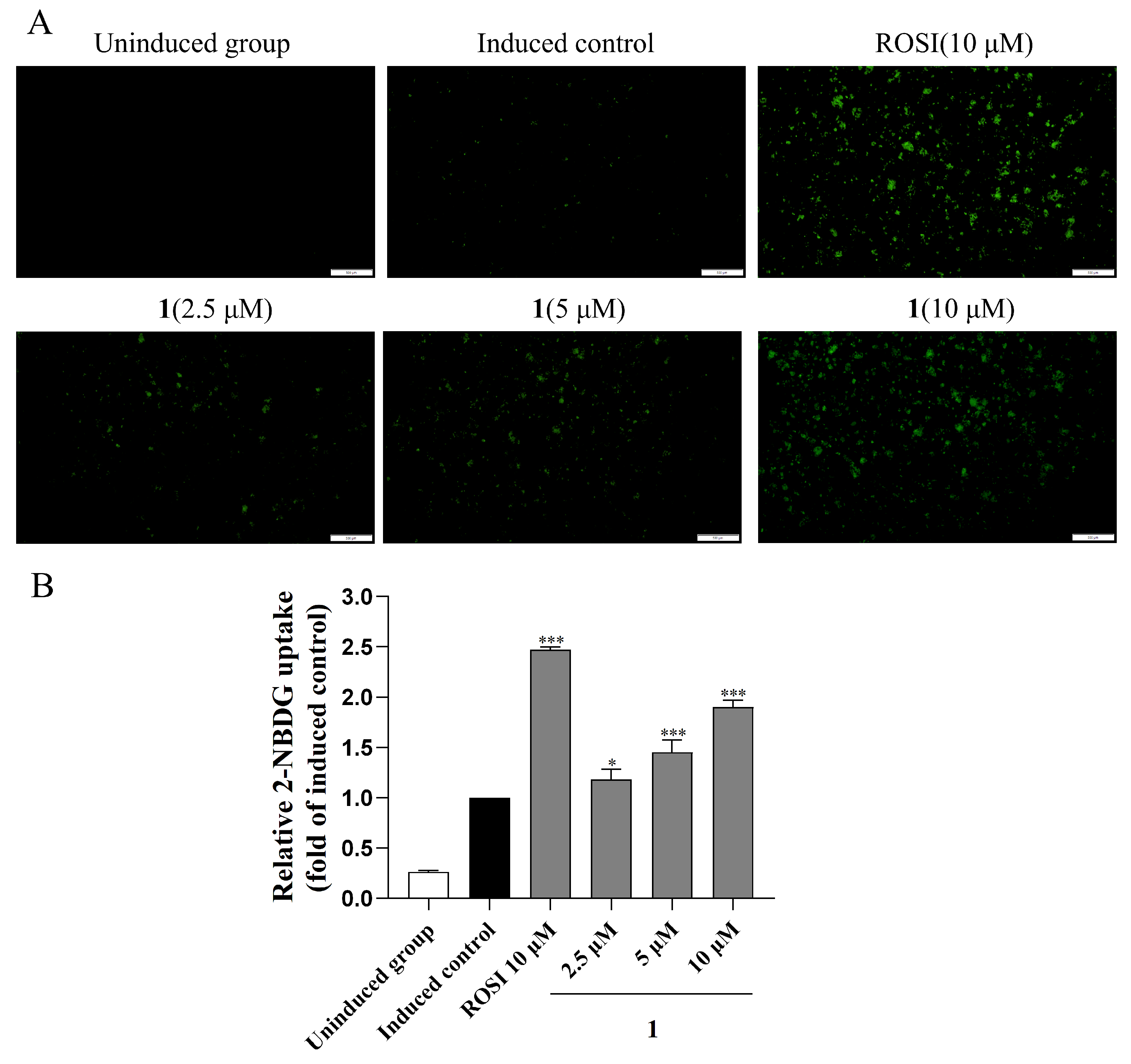 Figure 8. Evaluation of glucose uptake by compound 1 in HepG2 cells. (A) The representative fluorescence microscopic images of glucose uptake. (B) Quantitative analysis of glucose uptake. Fluorescence intensity was measured using a fluorescence microplate reader (Ex/Em = 460/540 nm). Rosiglitazone was employed as positive control. * p < 0.05, *** p < 0.001 vs. induced control. The scale bar represents 500 μm.