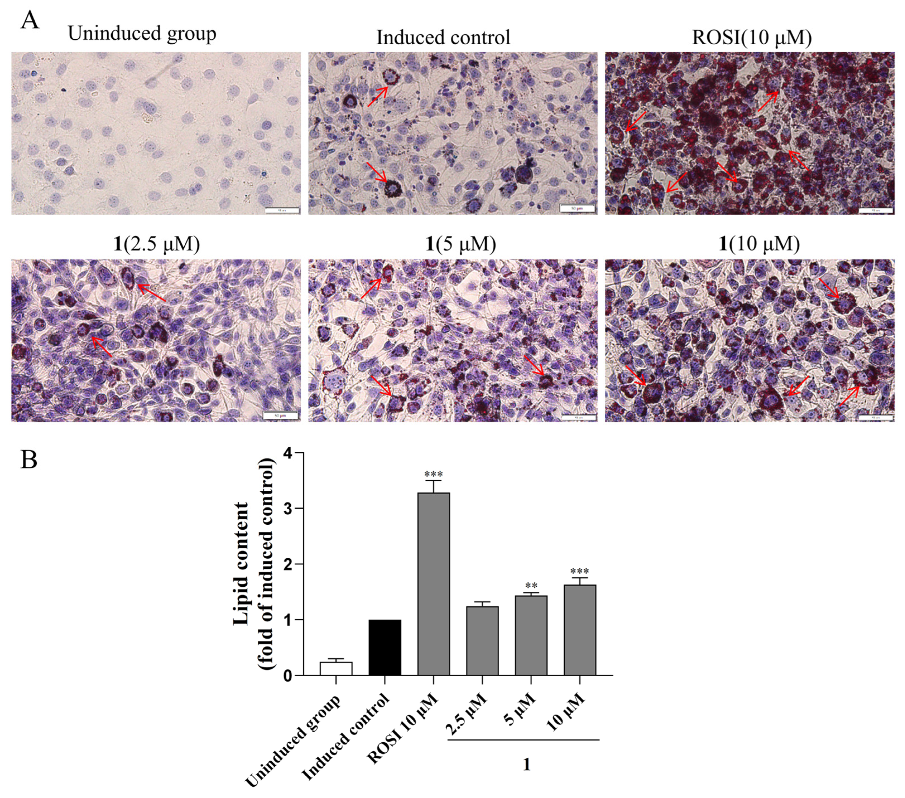 Figure 9. Effect of compound 1 on adipocyte differentiation and lipid accumulation in 3T3-L1 cells. (A) Morphology of 3T3-L1 after adipocyte differentiation with treatment of rosiglitazone and compound 1. Cells were stained with Oil Red O. Red droplets represent the lipid contents. (B) Quantitative analysis of lipid accumulation. The stained cells were washed with isopropanol, and the absorbance was measured at 510 nm using a microplate reader. The scale bar represents 50 μm. ** p < 0.01, *** p < 0.001 vs. induced control.