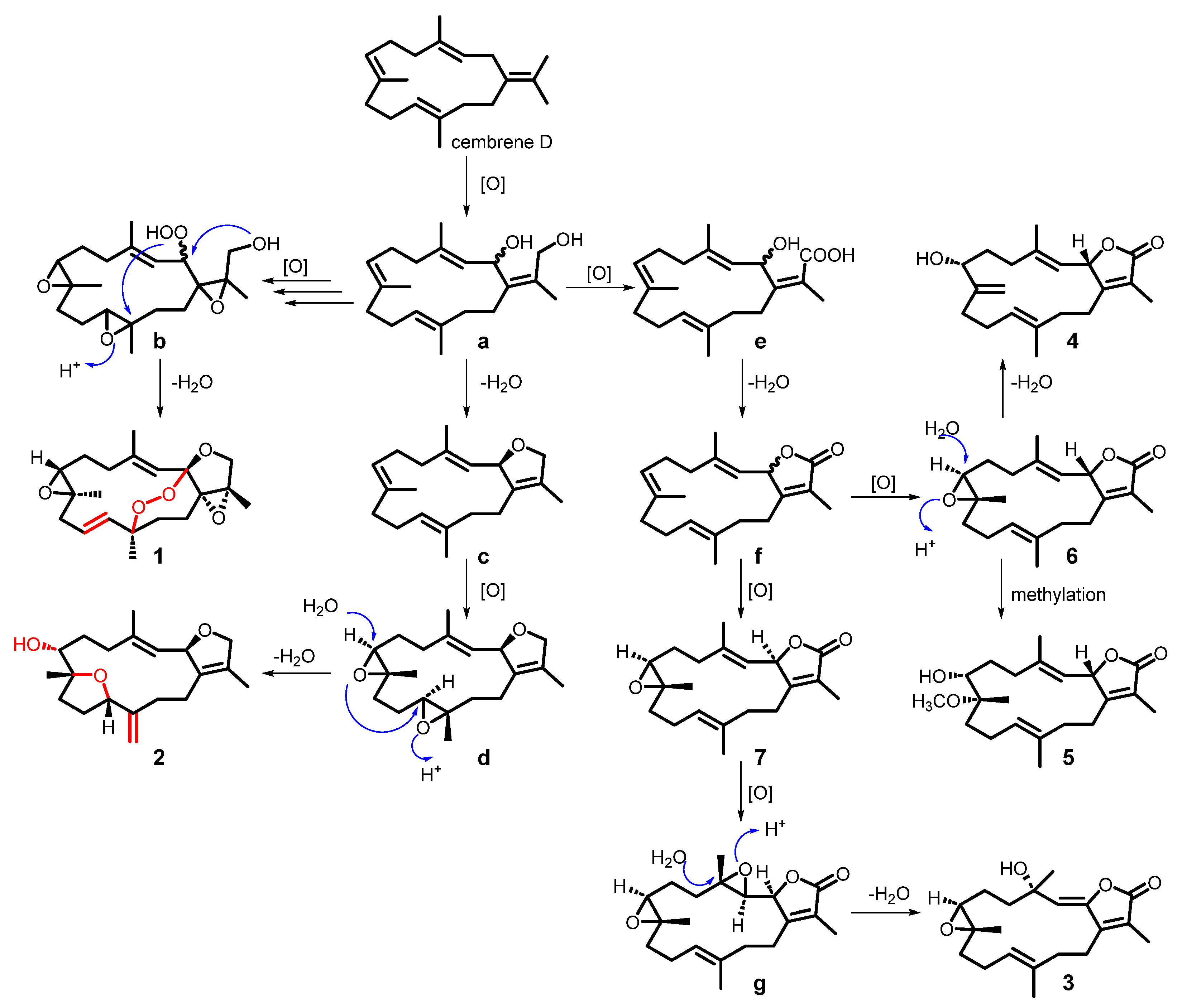 The close structural similarity among compounds 17 strongly suggested a common biogenetic origin. The proposed biosynthetic pathway originated from a simple precursor cembrene D. Initially, cembrene D underwent oxidation at different positions to yield intermediates a, b, and e, respectively. Intermediate a then underwent dehydration to yield intermediate c, characterized by a five-membered oxacyclic ring. Subsequent oxidation of c furnished intermediate d, which bears two epoxide functionalities at the C-7/C-8 and C-11/C-12 positions. The C-7/C-8 epoxide in d underwent ring opening via intramolecular nucleophilic attack by the C-8 hydroxyl group on C-11, leading to formation of a tetrahydrofuran ring bridging C-8 and C-11. Concurrent dehydration of the C-12 hydroxyl group generated a terminal double bond at C-12/C-20, ultimately affording compound 2. In intermediate b, nucleophilic attack by the C-16 hydroxyl on C-2 resulted in cyclization to form a five-membered oxygen-containing ring. Simultaneously, the C-2 hydroperoxy group attacked C-12, establishing a peroxide bridge between C-2 and C-12. Dehydration of the C-11 hydroxyl group introduced a double bond between C-10 and C-11, yielding compound 1. Intermediate e was transformed through a sequence of dehydration and oxidation steps to generate compounds 7 and 3. Oxidation of intermediate f produced compound 6. Subsequent C-7/C-8 ring-opening, when followed by dehydration or methylation, afforded compounds 4 or 5, respectively (Scheme 1). It is noteworthy that the proposed cyclization follows Baldwin’s rules, with the 5-exo-tetr process being both stereoelectronically allowed and kinetically favored.