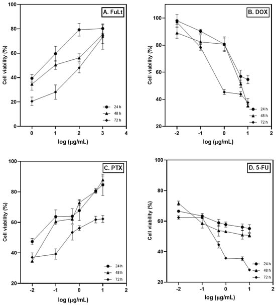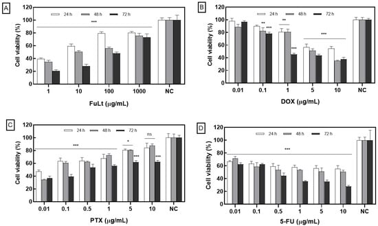 PTX inhibited spheroid viability at all three evaluated time points. In contrast, a concentration of 10 μg/mL only reduced viability after 72 h of treatment (Figure 1C). 5-FU produced significant cytotoxicity compared to the NC (* p < 0.05, ** p < 0.01, *** p < 0.001) and exhibited a concentration-dependent effect (0.01–10 μg/mL) at all three time points (Figure 1D). Cytotoxicity for FuLt and PTX showed an inverse relationship to concentration.
