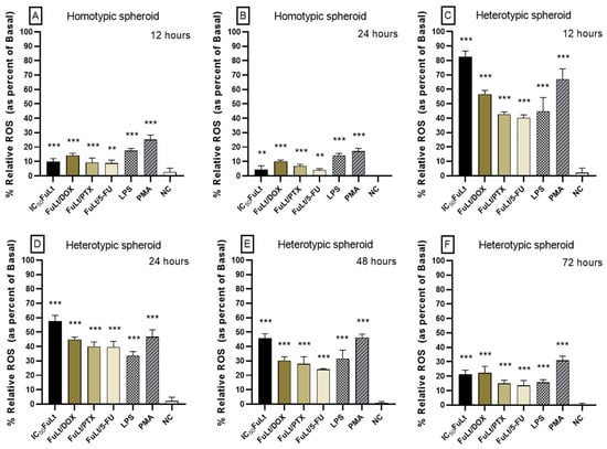 The relative production of ROS in homotypic spheroids (Figure 5A,B) treated with SI was higher after 12 h than after 24 h (p < 0.001 and p < 0.01, respectively). From 48 h onwards, low and insignificant amounts of ROS were produced compared to baseline production and were not plotted. In heterotypic spheroids (Figure 5C–F), ROS production decreased gradually from 12 to 72 h of treatment (p < 0.001). ROS production was higher in heterotypic spheroids than in homotypic spheroids.