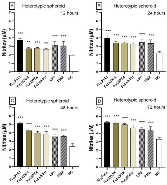 Furthermore, non-significant increase in nitric oxide (NO) was observed in homotypic spheroids treated with the SIs of the three chemotherapeutic agents. In heterotypic spheroids, the concentration of NO increased after 12 h, reaching its maximum after 72 h (Figure 6A–D) (p < 0.001 and p < 0.01). Additional assays with homotypic spheroids revealed an increase in NO with FuLt IC50 (p < 0.001) at 12, 24, 48 and 72 h (Figure S2).