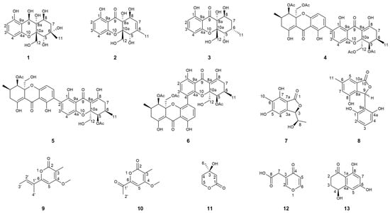 Mono-culture of DHS-48 or HHL-101 was initially inoculated onto Petri dishes with potato dextrose agar (PDA) at 28 °C for 5 days. Subsequently, a 1 cm2 single colony of both DHS-48 and HHL-101 was inoculated into Erlenmeyer flasks (160 × 1 L), each containing 100 g of rice and 100 mL of 0.3% of saline water and fermented at 28 °C for 30 days. A total of 160 flasks of extracted cultures were filled three times with 400 mL of EtOAc, and the filtrate was evaporated under reduced pressure to yield a crude extract of 90 g. Five fractions (Fr. 1–Fr. 5) were obtained by chromatographing the EtOAc extract on a silica gel column chromatography (CC), utilizing a step gradient elution with CH2Cl2-MeOH (0–100%). Fr. 2 underwent gradient elution with CH2Cl2-EtOAc (5:1, v/v) for open silica gel CC, producing six fractions Fr. 2.1–2.6. Compound 4 (30 mg) was obtained by subjecting Fr. 2.3 to open silica gel CC utilizing gradient elution with CH2Cl2-EtOAc (4:1, v/v). To obtain compound 5 (100 mg), Fr. 2.4 was exposed to open silica gel CC utilizing gradient elution with CH2Cl2-EtOAc (4:1, v/v). To obtain compound 6 (300 mg), Fr. 2.6 was submitted to open silica gel CC utilizing gradient elution with CH2Cl2-EtOAc (3:1, v/v). Fifth fractions (Fr. 4.1–Fr. 4.5) were obtained by silica gel separation of Fr. 4 using CH2Cl2-EtOAc (1:1, v/v). Compound 11 (20 mg) was obtained by purifying Fr. 4.1 using Sephadex LH-20 CC using MeOH-CH2Cl2 (1:1, v/v). Reversed-phase HPLC (MeOH-H2O 60:40, v/v) was performed on Fr. 4.2 to obtain compounds 9 (2 mg), 10 (2 mg), and 12 (2 mg). Reversed-phase HPLC (MeOH-H2O 55:45, v/v) was performed on Fr. 4.3 to extract compounds 8 (3 mg) and 13 (3 mg). Compound 7 (2 mg) was obtained by purifying Fr. 4.4 using Sephadex LH-20 CC (CH2Cl2/MeOH, 1:1, v/v) and then undergoing reversed-phase HPLC (MeOH-H2O 55:45, v/v). Fr. 5 was subjected to open silica gel CC using gradient elution with CH2Cl2-EtOAc (1:1, v/v) to yield six fractions (Fr. 5.1–5.6). Compounds 1 (4 mg), 2 (6 mg), and 3 (5 mg) were obtained by purifying Fr. 5.3 using Sephadex LH-20 CC (CH2Cl2/MeOH, 1:1, v/v) and then undergoing reversed-phase HPLC (MeOH-H2O 40:60, v/v).