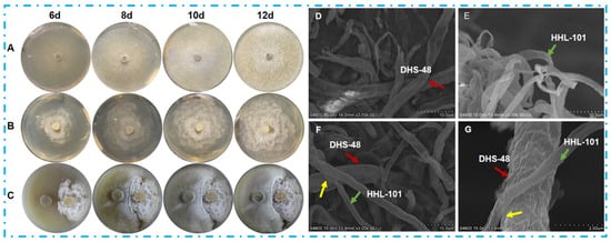 The fungal phenotype serves as a critical indicator of secondary metabolite biosynthesis potential, with metabolic adaptations often mediating interspecies competition in co-culture systems [,]. Physical interactions between DHS-48 and HHL-101 were confirmed via morphology and SEM observation. Figure 2 illustrated the morphological characteristics of DHS-48 and HHL-101 (both mono-cultures and co-cultures) cultured on the PDA medium at 28 °C, with growth observed at 6, 8, 10, and 12 days post-inoculation. For the DHS-48 mono-culture (Figure 2A), initial growth on day 6 exhibited sparse, white, fluffy mycelial expansion; by day 8, colonies developed into dense, velvety structures with yellow-brown undersides. At day 10, radial growth accelerated centrally and spread outward in an annular circle pattern, forming concentric growth rings, and achieved complete medium coverage (90 mm diameter) at day 12. While in the HHL-101 mono-culture (Figure 2B), hyphae displayed cotton-like white texture with regular radial expansion at day 6, reaching 90 mm diameter at day 12. Co-culture systems, as observed in Figure 2C, revealed competitive interactions altering growth trajectories, resulting in temporally divergent morphological development compared to respective mono-culture counterparts. At day 6, the mycelium of HHL-101 appeared dense and robust with distinct growth areas, whereas DHS-48 appeared sparse compared to its mono-culture, and a pronounced mycelia-free zone was observed between these two fungi strains; this stark contrast suggested that HHL-101 restricted the growth of DHS-48 and held a competitive advantage during the initial co-culture phase. When DHS-48 was co-cultured with HHL-101 on days 8 to 12, contacts between both mycelia were observed at certain spots on the pigmented interfacial zone formed at the mycelial confrontation front, accompanied by altered mycelial morphology. Notably, DHS-48 exhibited accelerated hyphal growth concurrent with a dark-yellow medium discoloration, correlating with elevated yellow secondary metabolites secretion. These adaptive responses align with fungal defense mechanisms documented in competitive coexistence systems, where secondary metabolite diversification enhances survival under competitive stress [], indicating that DHS-48 employed chemically mediated resistance as a defense to mitigate HHL-101-induced suppression to boost survival. The reciprocal metabolic suppression and adaptive countermeasures observed in co-cultured DHS-48 and HHL-101 highlight an evolutionary conserved defense paradigm analogous to fungal competition strategies, potentially driving the biosynthesis of novel bioactive metabolites that remain underrepresented in existing natural product repositories.