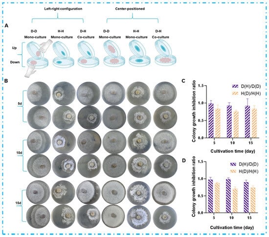 Effect of VOCs on colony morphology of DHS-48 (abbreviated as “D”) and HHL-101 (abbreviated as “H”); D-D denotes the mono-culture of strain DHS-48, H-H represents the mono-culture of strain HHL-101, and D-H indicates the co-culture of both DHS-48 and HHL-101. The ratio D(H)/D(D) corresponds to the average colony diameter of DHS-48 under co-culture conditions relative to that under mono-culture conditions. Similarly, the ratio H(D)/H(H) represents the average colony diameter of HHL-101 in co-culture compared to that in mono-culture. These ratios serve as indicators for evaluating the mutual inhibitory effects between the two strains when cultured together. (A) Experimental setup schematic for VOC exposure assay. (B) Representative colony morphologies at 5, 10, and 15 days. Colony growth inhibition ratio under VOC exposure (C) agar blocks: left-right configuration, (D) agar blocks: center-positioned.