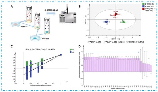 (A) DHS-48 and HHL-101 (mono-culture and co-culture) were cultivated directly in SPME bottles, and the volatile fraction was analyzed directly using headspace GC-MS; (B) the OPLS-DA score plot for volatiles of DHS-48 and HHL-101 for mono-culture and co-cultures (green spheres represent DHS-48 cultured alone, blue spheres represent HHL-101 cultured alone, red spheres represent DHS-48 co-cultured with HHL-101); (C) permutation test plot; (D) VIP value chart of volatile components in volatiles for mono-culture and co-culture of DHS-48 and HHL-101 (VIP values are provided in Table S5).