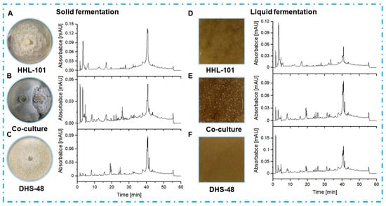 HPLC profiles of EtOAc extracts from DHS-48 and HHL-101 mono-cultures and co-cultures under solid (A–C) and liquid (D–F) fermentations. HPLC chromatograms: C18 column (Waters, 5 μm, 10 × 150 mm). Solvents: A, H2O; B, MeOH. Linear gradient: 0–5 min, 25% B; 5–15 min, 25–30% B; 15–30 min, 30–55% B; 30–40 min, 55–75% B; 40–50 min, 75–90% B; 50–60 min, 90–100% B. Temperature: 25 °C. Flowrate: 0.8 mL/min. UV detection at λ = 210 nm. Samples were normalized to 1.0 mg/mL (5 µL injection).