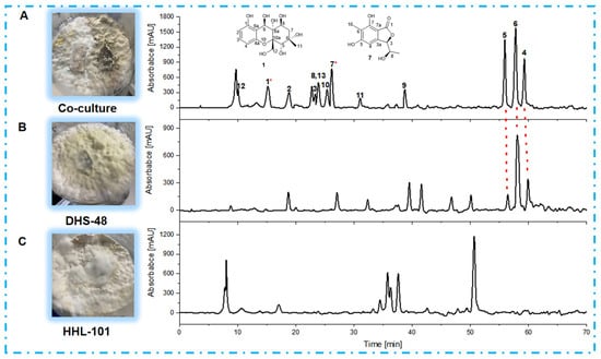 HPLC chromatograms of EtOAc extracts derived from (A) DHS-48 and HHL-101 co-culture; and the mono-cultures of (B) DHS-48 and (C) HHL-101. * Compounds 1 and 7 in (A) represent the new compounds induced during co-culture. HPLC chromatograms: C18 column (Agilent Technologies 10 mm × 250 mm). Solvents: A, H2O; B, MeOH. Linear gradient: 0 min, 10% B; 70 min, 80% B. Temperature: 25 °C. Flow rate: 2 mL/min. UV detection at λ = 210 nm.