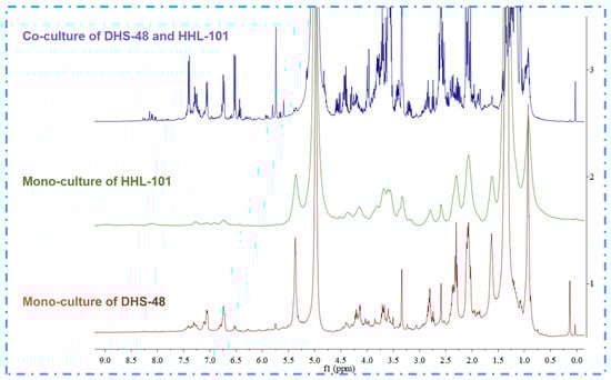 1H NMR spectra (400 MHz, CD3OD) of EtOAc extracts of DHS-48 and HHL-101 under mono- and co-cultures, chemical shifts (δ) presented in ppm.