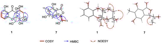 Key COSY, HMBC, and NOESY correlations of compounds 1 and 7.