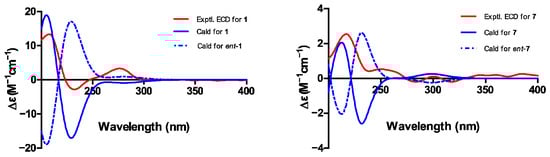 Experimental and calculated electronic circular dichroism (ECD) spectra of 1 and 7.