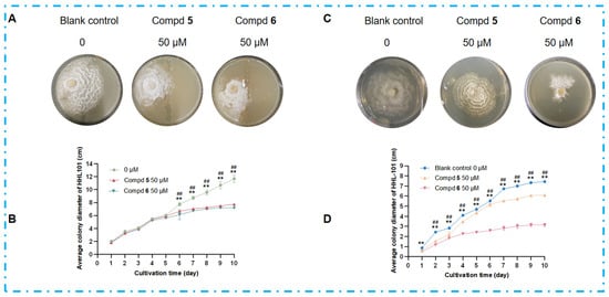Effects of antimicrobial metabolites 5 and 6 on HHL-101 growth inhibition and morphological alterations. (A) Mycelial morphology and (B) average colony diameter dynamics of HHL-101 after 10 days on 14 cm PDA plates, with 5/6 (0, 50 μM) restricted to the central 1 cm region. (C) Mycelial morphology and (D) average colony diameter dynamics of HHL-101 in 9 cm PDA plates treated with compounds 5/6 (0, 50 μM). # p < 0.05, ## p < 0.01 blank control group compared to compd 5 group; * p < 0.05, ** p < 0.01 blank control group compared to compd 6 group.