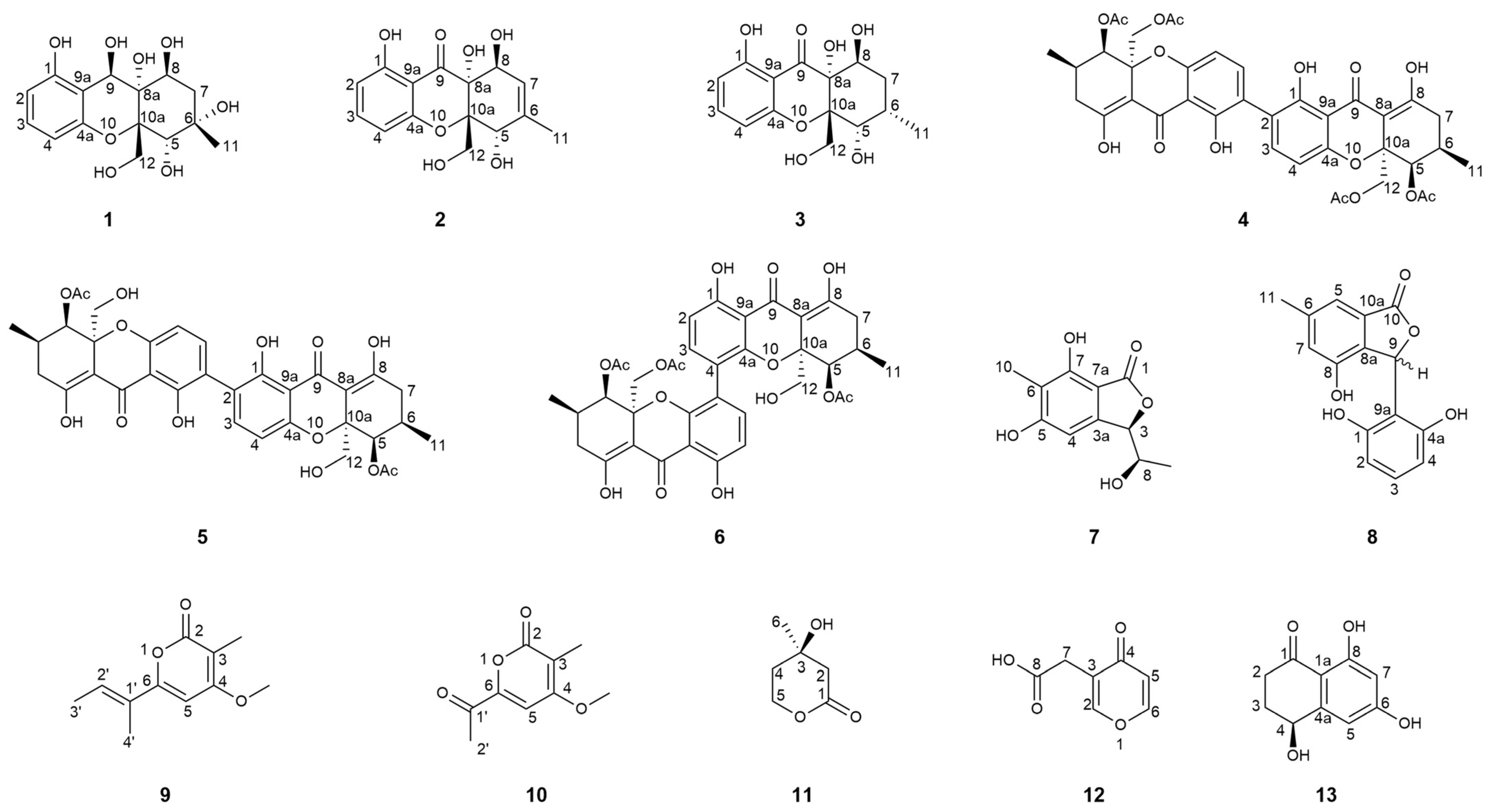 - Shiono, Y.; Sasaki, T.; Shibuya, F.; Yasuda, Y.; Koseki, T.; Supratman, U. Isolation of a Phomoxanthone A derivative, a new metabolite of tetrahydroxanthone, from a Phomopsis sp. isolated from the mangrove, Rhizhopora mucronata. Nat. Prod. Commun. 2013, 8, 1735–1737. [Google Scholar] [CrossRef] [PubMed]