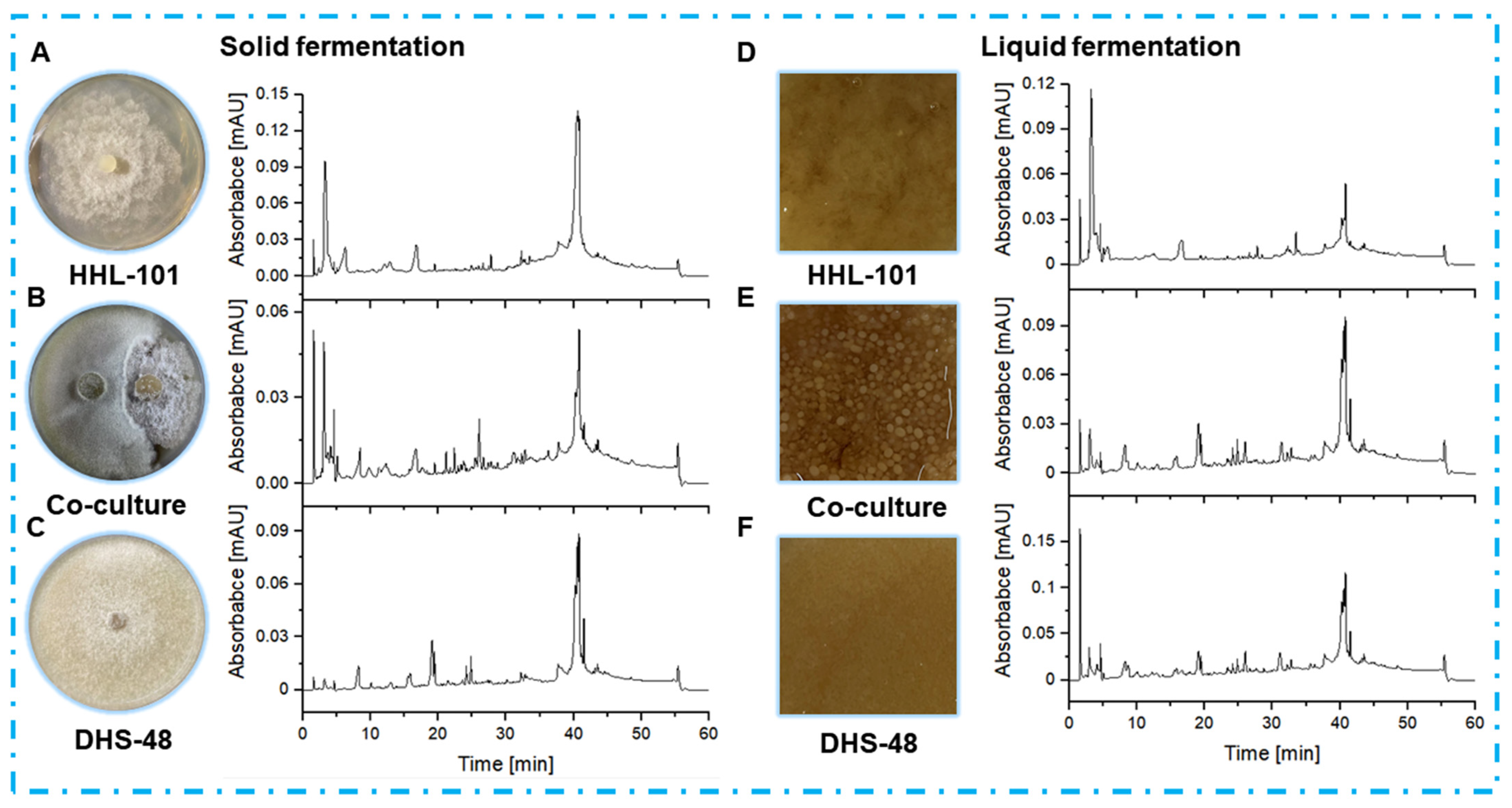 3.8. Small-Scale Fermentation of Liquid and Solid Media for DHS-48 and HHL-101 in Mono-Culture and Co-Culture