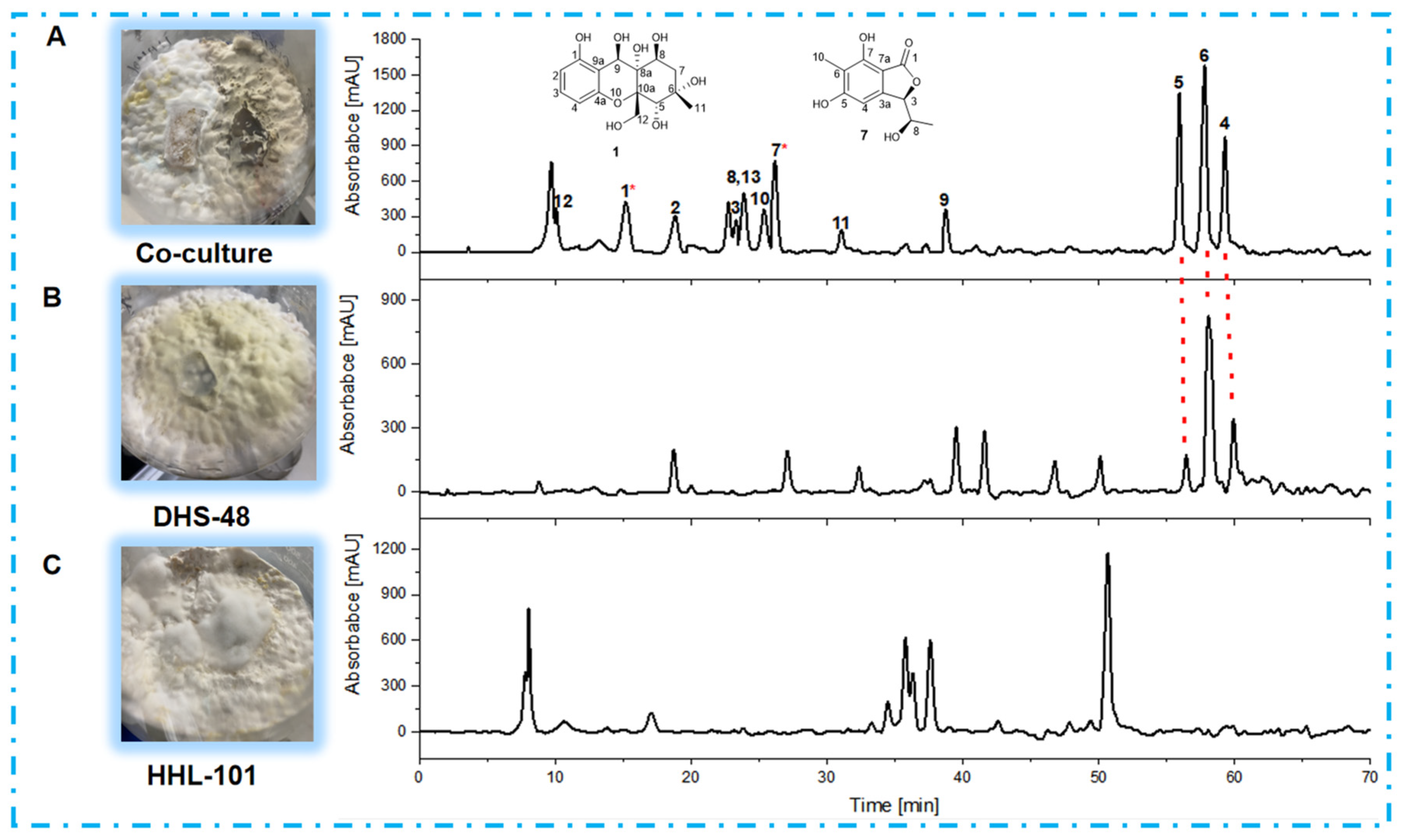 - Wu, J.; Ye, J.; Cen, J.; Chen, Y.; Xu, J. Induction of Three New Secondary Metabolites by the Co-Culture of Endophytic Fungi Phomopsis asparagi DHS-48 and Phomopsis sp. DHS-11 Isolated from the Chinese Mangrove Plant Rhizophora mangle. Mar. Drugs 2024, 22, 332. [Google Scholar] [CrossRef]