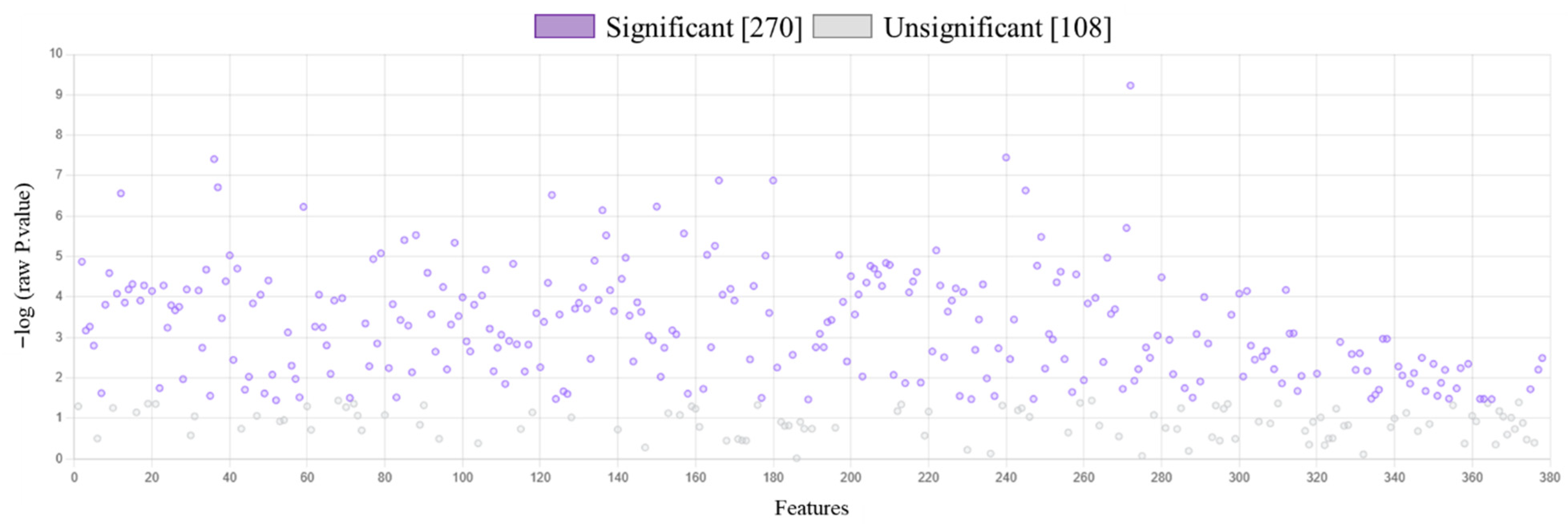 - Pang, Z.; Zhou, G.; Ewald, J.; Chang, L.; Hacariz, O.; Basu, N.; Xia, J. Using MetaboAnalyst 5.0 for LC–HRMS Spectra Processing, Multi-Omics Integration and Covariate Adjustment of Global Metabolomics Data. Nat. Protoc. 2022, 17, 1735–1761. [Google Scholar] [CrossRef]