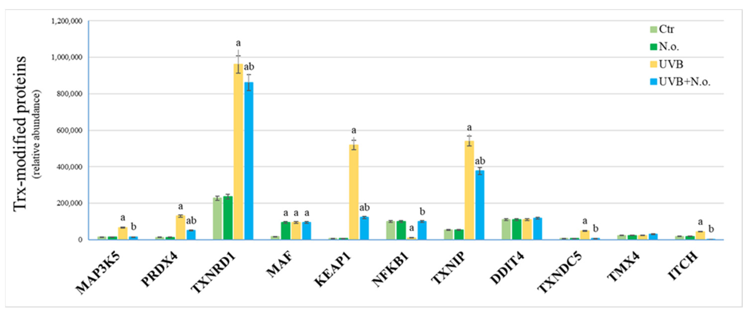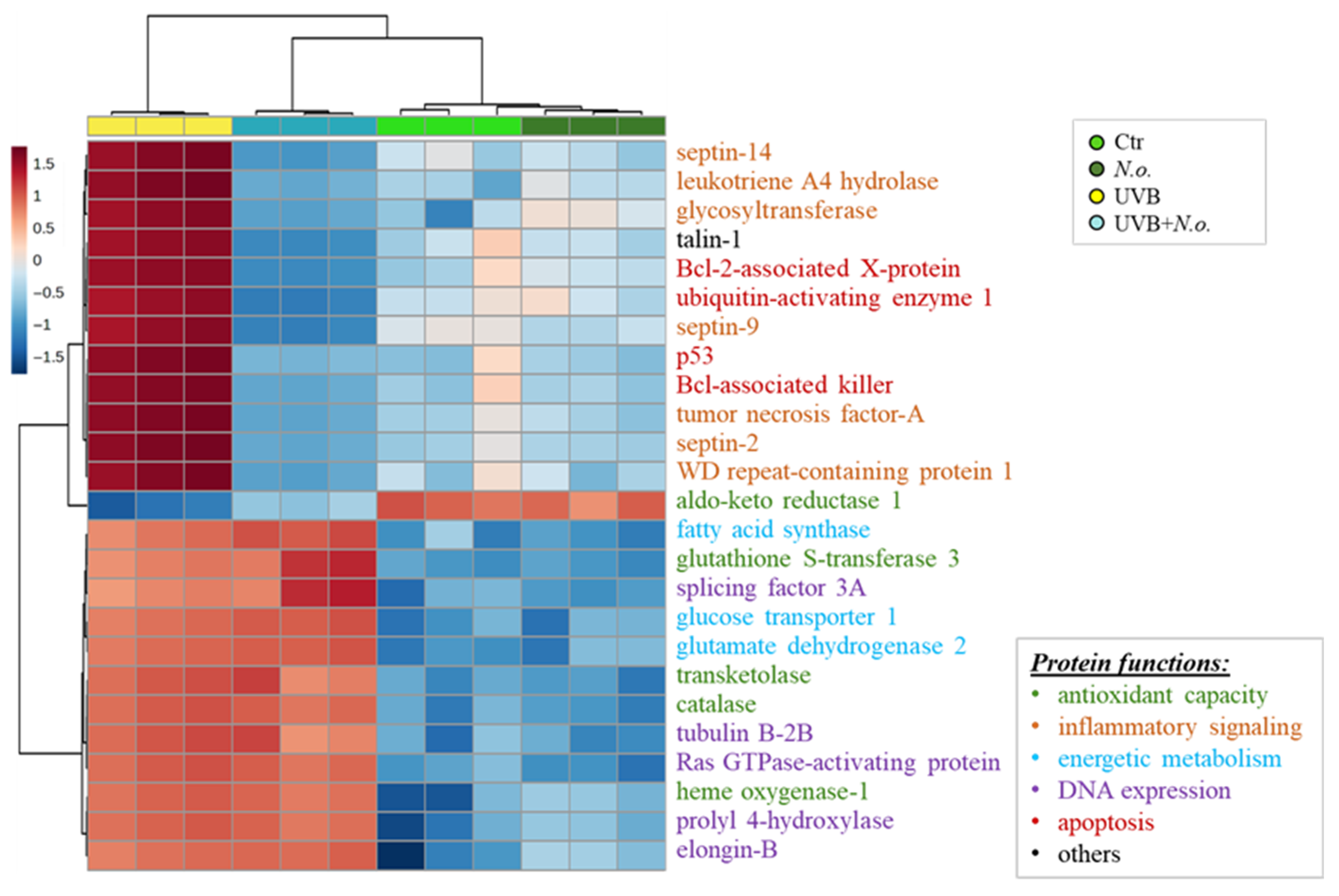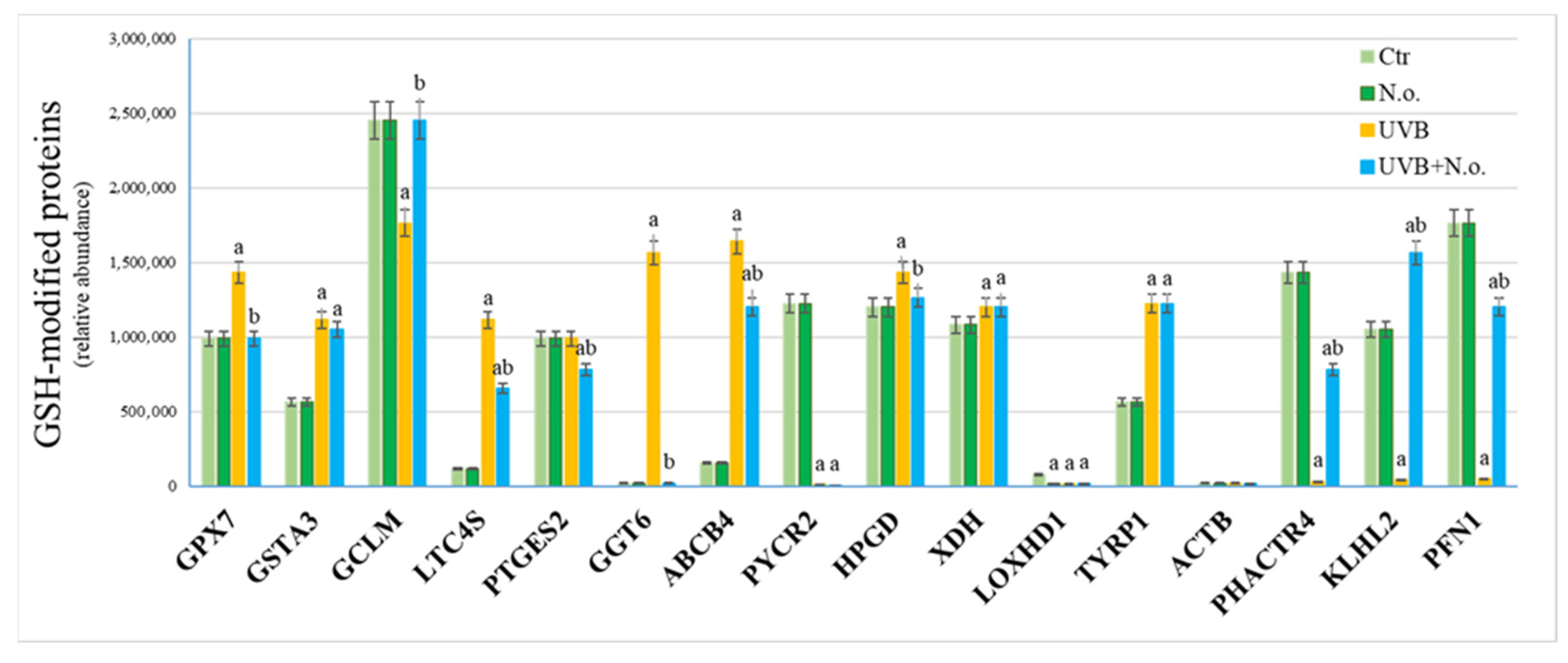 - Perluigi, M.; Di Domenico, F.; Blarzino, C.; Foppoli, C.; Cini, C.; Giorgi, A.; Grillo, C.; De Marco, F.; Butterfield, D.A.; Schininà, M.E.; et al. Effects of UVB-Induced Oxidative Stress on Protein Expression and Specific Protein Oxidation in Normal Human Epithelial Keratinocytes: A Proteomic Approach. Proteome Sci. 2010, 8, 13. [Google Scholar] [CrossRef]
